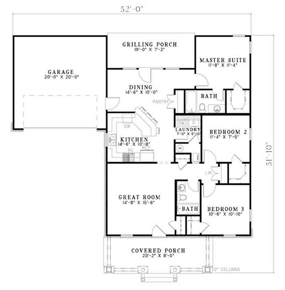 This lovely homeplan has excellent street appeal. Relax on the comfortable covered porch and greet passersby. From there, entry into this home takes you directly into the spacious great room, perfect for entertaining. An angled bar with seating separates this well-equipped kitchen from the adjacent dining room. A large rear-grilling porch is also available for cookouts. Two secondary bedrooms occupy the front of this home while your private master suite is nestled peacefully in the back of this design.