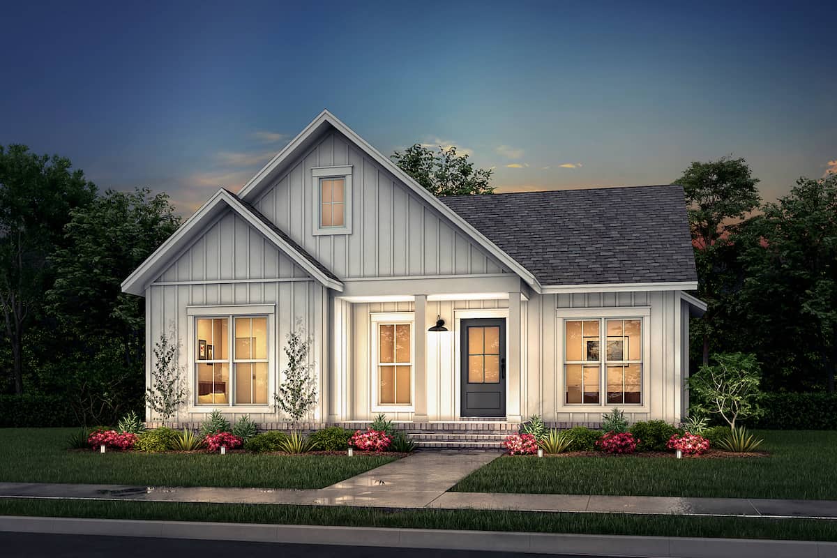 You'll enjoy coming home to this quaint Contemporary style Ranch home with vaulted ceiling in the Great Room. Its style-appropriate use of materials – especially the vertical board-and batten siding in light gray with white trim and the large divided-lite windows – and forward-facing gables give it an attractive curb appeal. The adorable 1-story home's floor plan has 1254 square feet of heated and cooled living space and includes 2 bedrooms.