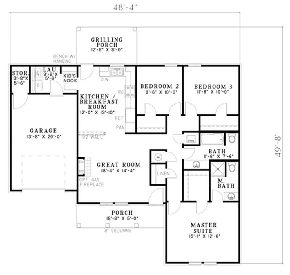 This house plan has 8 inch columns on Front Porch Great room with optional gas fireplace open to Kitchen with access to Rear Grilling Porch Half wall between Great room and Kitchen Master Suite with walk-in closet and private Master Bath Large closets for Bedrooms 2 and 3 Kid's Nook with bench and hanging storage near Laundry