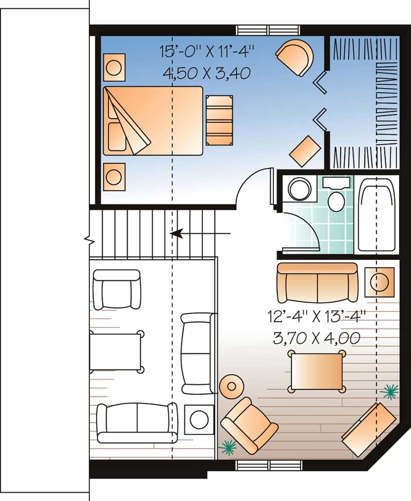 1st level: Closed foyer with coat closet and storage, family room, eat-in kitchen, bedroom, shower room. 2nd level: Master bedroom with walk-in closet, boudoir or bedroom #3 in mezzanine, bathroom.