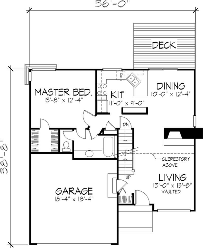 An oversized window arrangement topped by a radiant row of clerestory windows gives this upscale two-story a sunny countenance. Inside, a vaulted ceiling crowns the living room, which also features a fireplace. Sliding glass doors in the dining room open to a backyard deck that is perfect for summer barbecues.