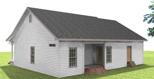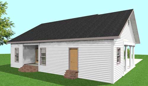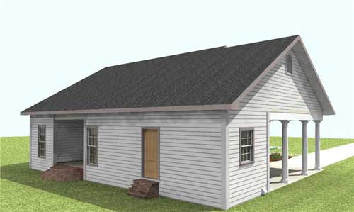 House Plans DP-1301 have a covered front porch that leads you into this 1301 total living square feet. The floor plan includes 2 bedrooms, 2 bathrooms, and a single car garage/ carport.
