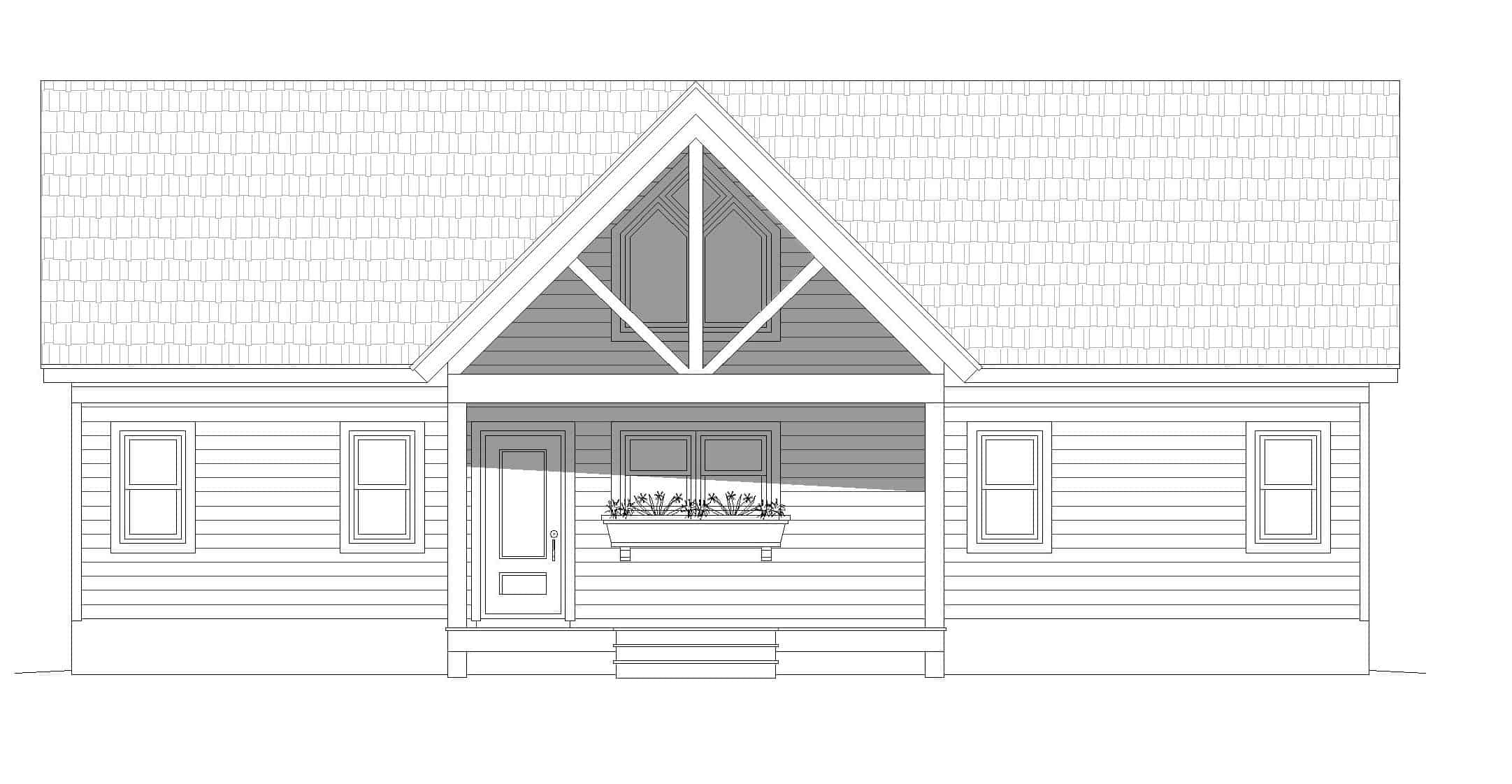 This 1-story Country Ranch style house has 1304 square feet total heated and cooled area that maximizes every available square foot of space. The house has 1357-square-foot unfinished basement; versions with slab and crawlspace foundations are also available. The pleasant front porch with timber-framed roof covering gives the home a spectacular curb appeal. The house will make a great first home for a young family or, with its wide rear porch overhanging the standard walkout/daylight basement, a terrific vacation home on a lake or...