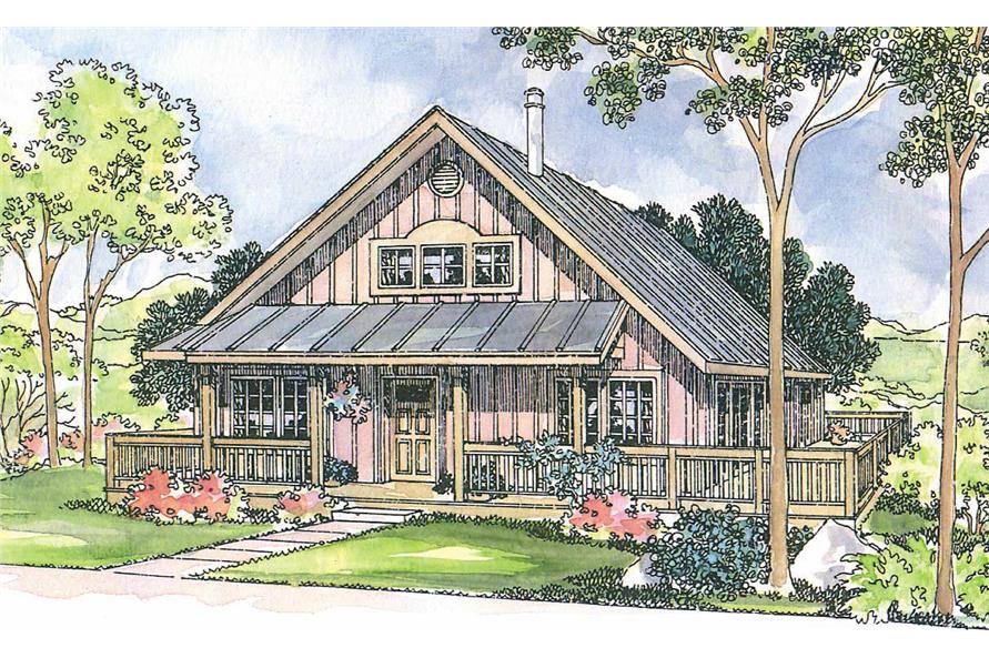 This two-story, cottage style lakefront home has 1306 total living square feet. A wide, partly covered deck wraps around two sides of this small vacation retreat cabin home plan. The vaulted great room is naturally bright during the day. It's fully open to the nook and partially open to the kitchen along an eating bar that fronts the sink. Two bedrooms are downstairs; a loft, storage, and bathroom are above.