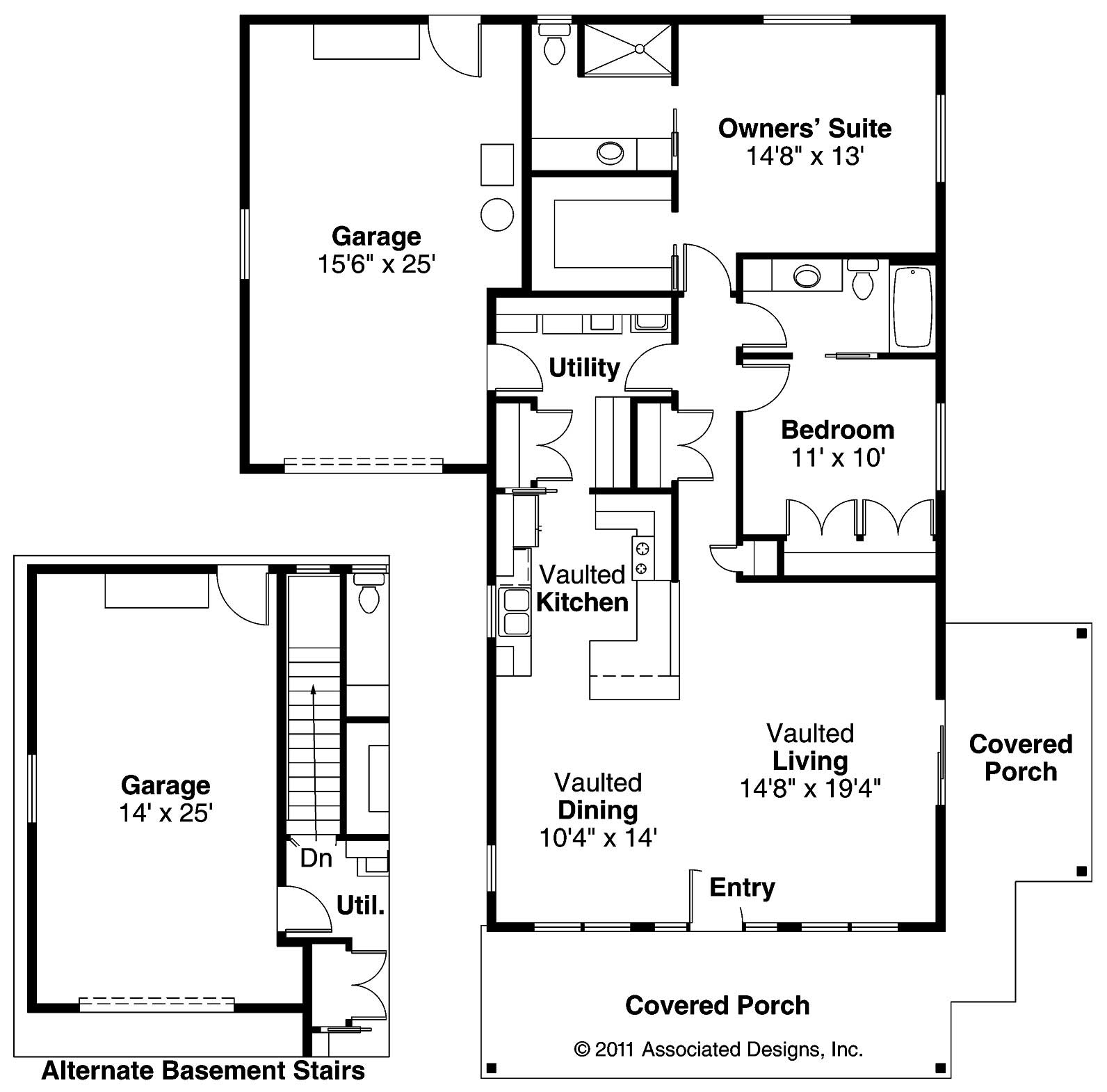 The #108-1612 home plan is a single story, cabin style house plan with 1321 total living square feet. This charming two-bedroom cabin home plan has a welcoming front porch that spans the front and wraps around to one side. Vaulted ceilings add to the sense of spaciousness where the dining, living and kitchen areas are open to each other. Shelves and a closet line the hall that links the kitchen, utility room, and garage.