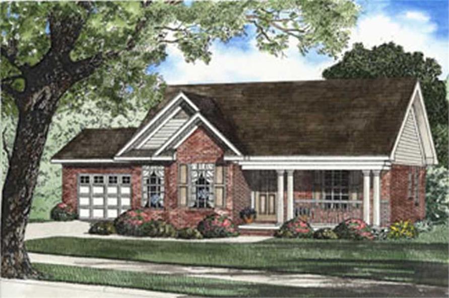 This well-done small country ranch (House Plan #153-1345) has 1321 square feet of living space. The 1-story floor plan includes 3 bedrooms. Inside, a 9-foot boxed ceiling in the Great Room makes the home feel much more spacious. The dining room is at the rear of the home and conveniently located next to the rear grilling porch. The efficiently-designed kitchen enjoys a peninsula and an eating bar. The master suite has a large walk-in closet and a master bath with his-and-her sink vanities. The other two bedrooms share a hallway bathroom.