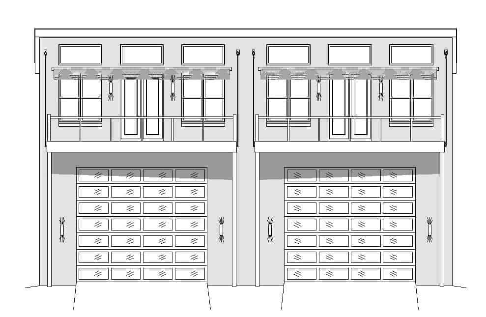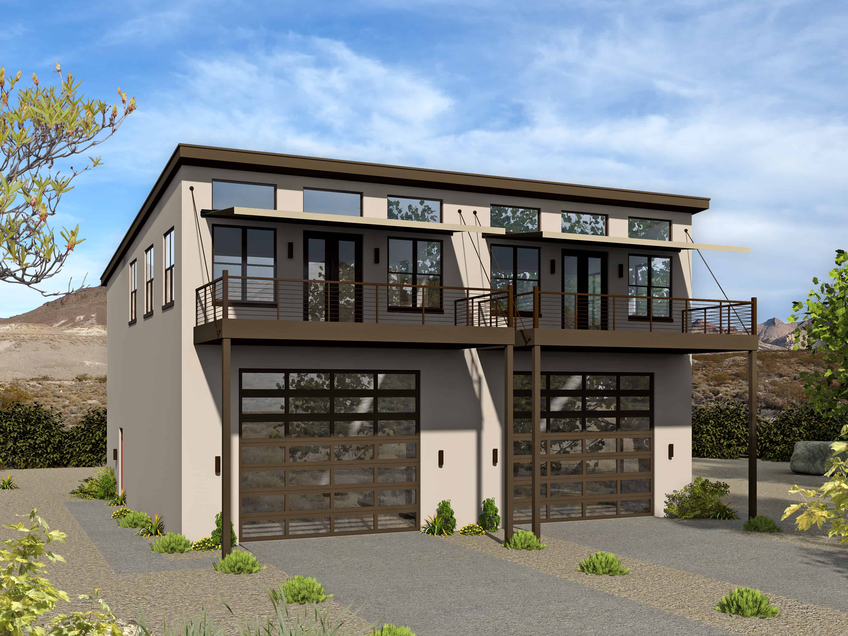 This contemporary duplex has 1400 square feet of living space per unit. Unfinished sq ft per unit includes an 1100 sq ft garage and a 250 sq ft porch.