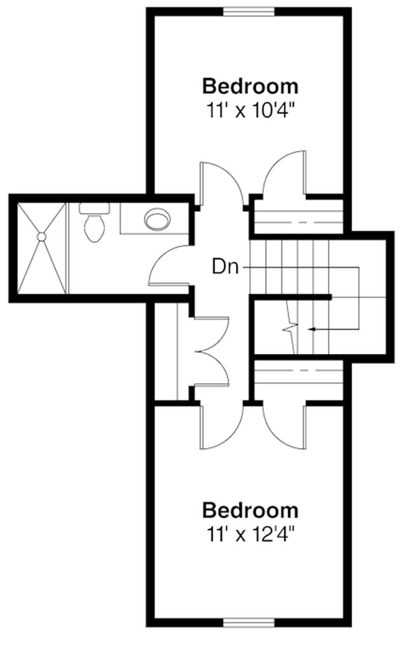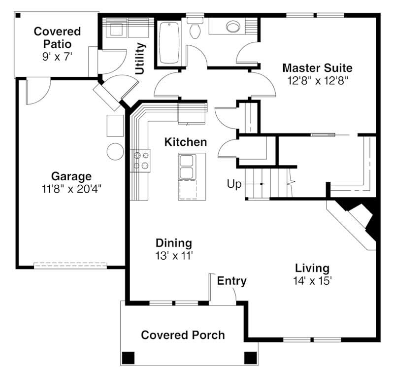 The #108-1296 plan is a 2-story, Cottage style house plan with 1426 total living square feet. This compact Cottage home features 2 bedrooms and a shared bathroom upstairs. The living room with a gas fireplace is open to the dining room and kitchen. The master suite on the main floor has a roomy walk-in closet and a tub/shower in the bath as well.