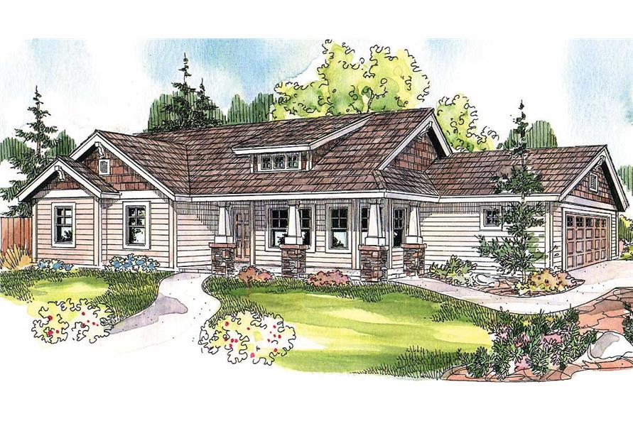 The #108-1144 set of house plans is a single story, Craftsman style plan with 1484 total living square feet. The expansive great room at the front of this bungalow home plan is vaulted, informal, and naturally bright. A long eating bar partially separates the vaulted kitchen and dining room. Bedrooms, bathrooms, storage and a fully shelved utility room fill the left wing.