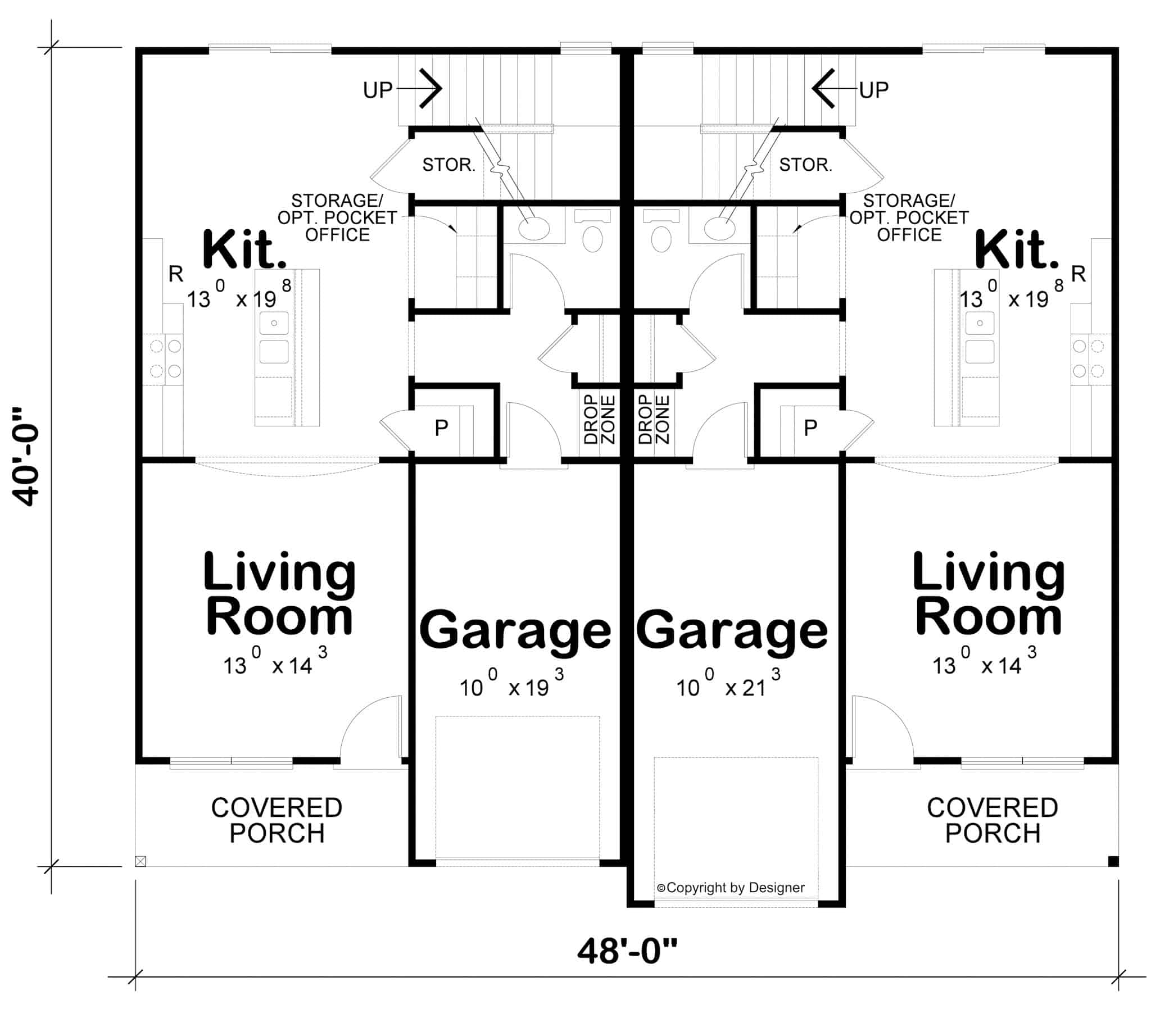 Note 2: This multi-family plan has two identical units. Each unit has 764 living square feet, 3 bedrooms, 2.5 baths, and 1-car garage spaces.