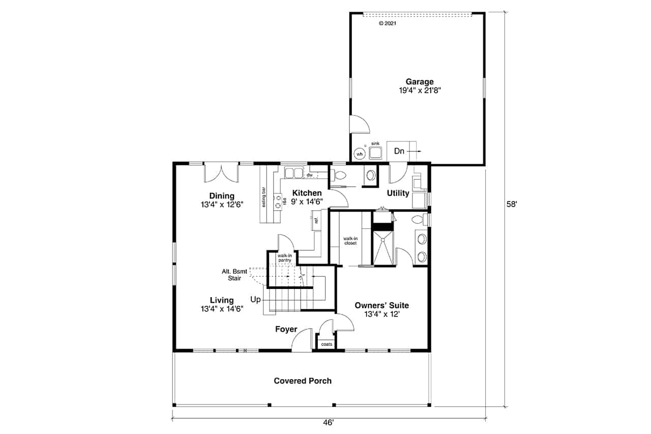 The #108-1225 home plan is a two story, craftsman style house plan with 1580 total living square feet. This craftsman home plan features a railed porch that spans the entire front; garage has an old-fashioned alley entrance. The large gathering space is windowed on three sides and fills the left wing. The kitchen range is built into the long eating bar and linked to the dining room.