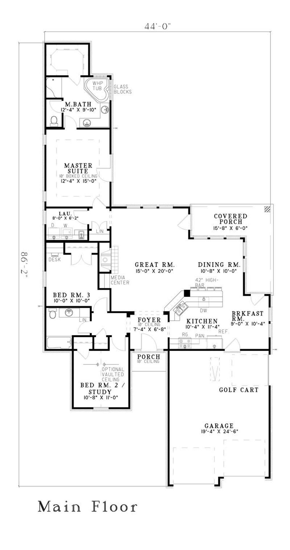 Step inside this country house plan and enter a beautiful formal foyer with a ten foot ceiling. The foyer opens into a wonderfully spacious family area, perfect for special quality time. Visit with family or entertain friends on the timeless covered porch overlooking a calming lake or rolling golf course. Accessibility to both the great room and a cozy breakfast nook makes this porch both relaxing and convenient. Finally, enjoy your secluded master suite and bath complete with corner whirlpool tub and privacy corner glass block windows.
