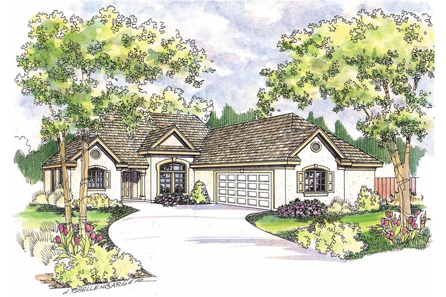 The #108-1276 home plan is a single story, European style house plan with 1605 total living square feet. Stucco detailing accents this single-level European home plan that has a large gathering space at its core. A bayed nook expands the kitchen that offers an abundance of work and storage space. The luxurious owners' suite is well-isolated and boasts a dual vanity, deep soaking tub, and a roomy shower. The utility room links with the garage.