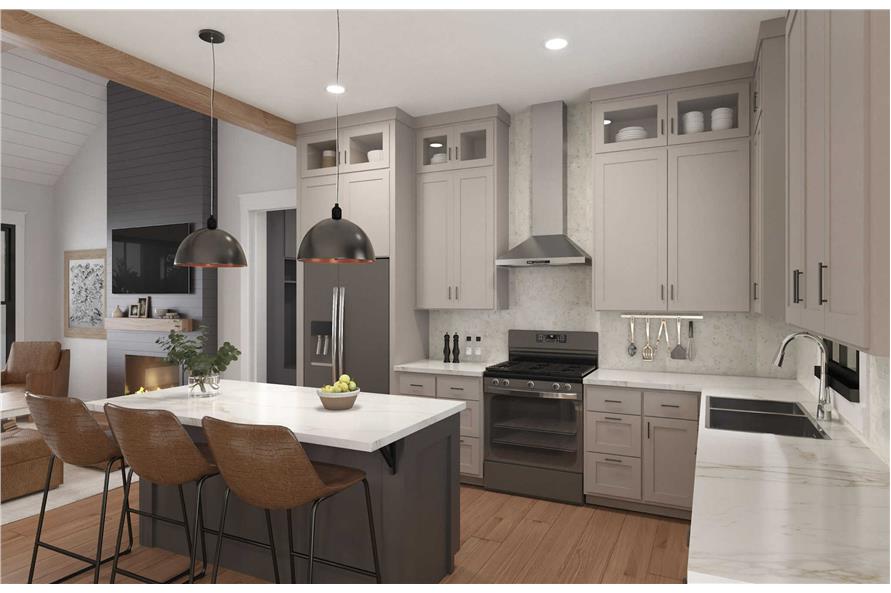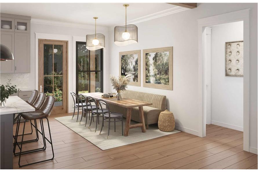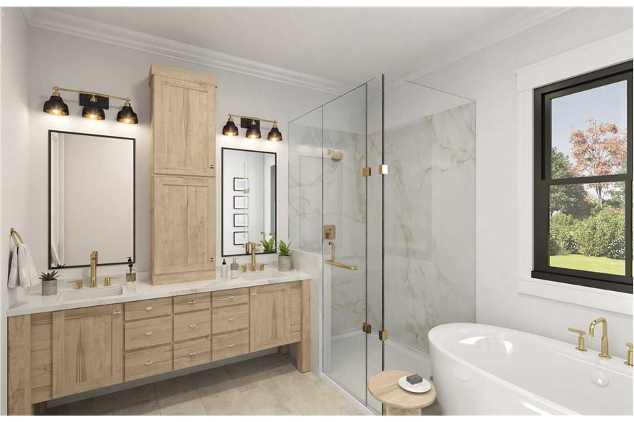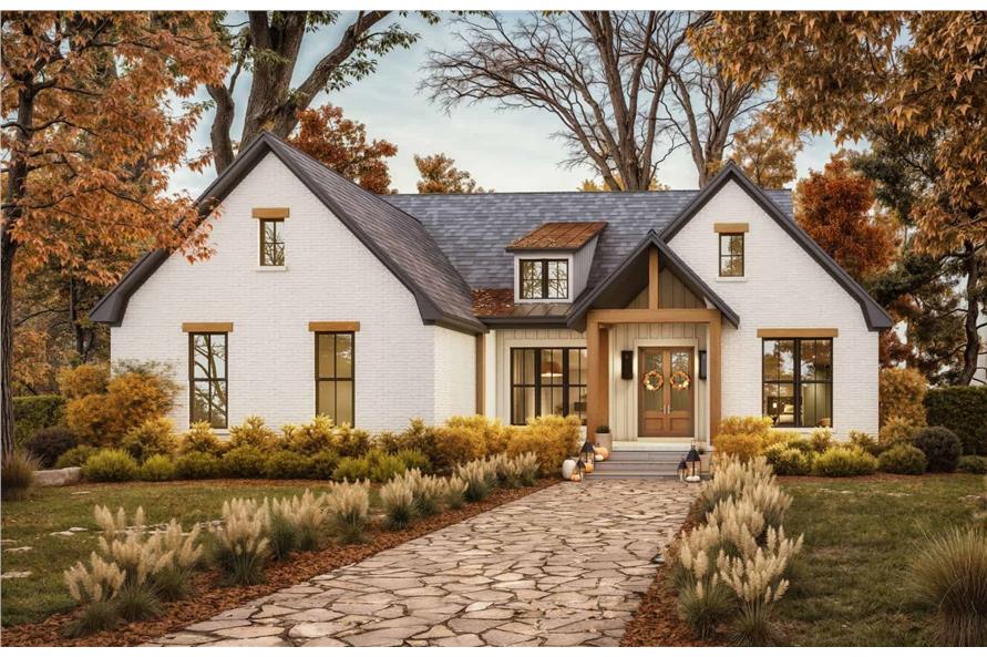 This 3-bedroom, 1690 sq ft Transitional Plan features an open split layout, volume ceilings, and a main suite with a standalone tub, large custom shower, and spacious closet. Includes a walk-in pantry and mudroom for added convenience.