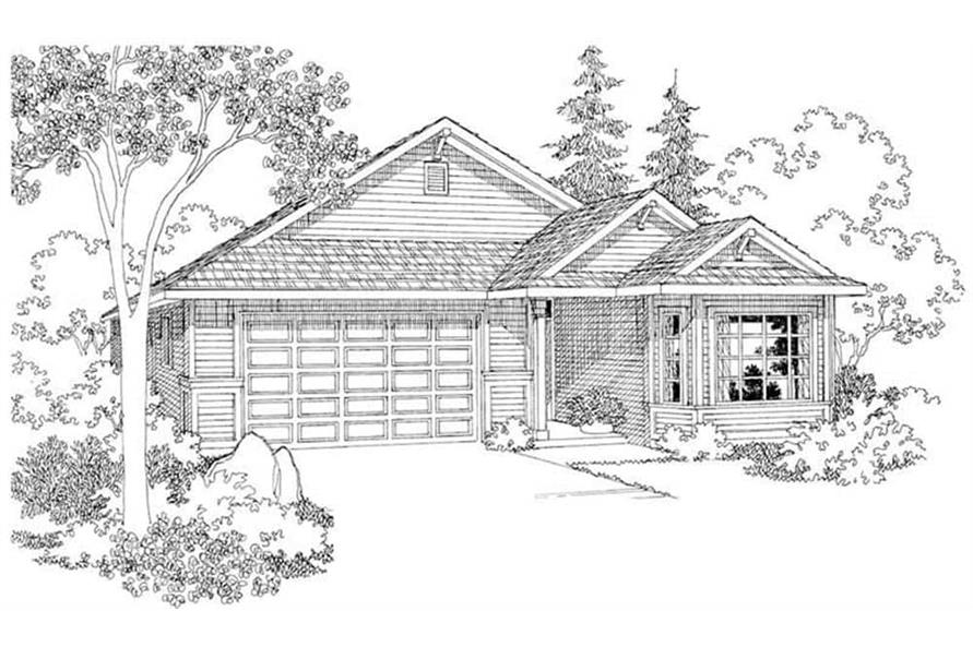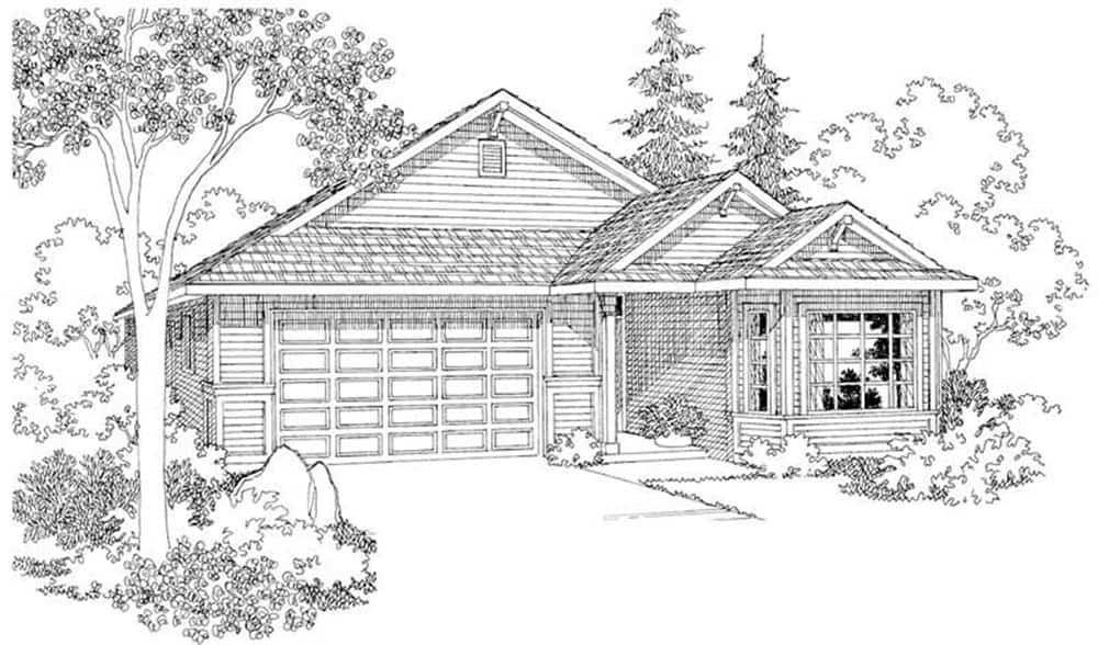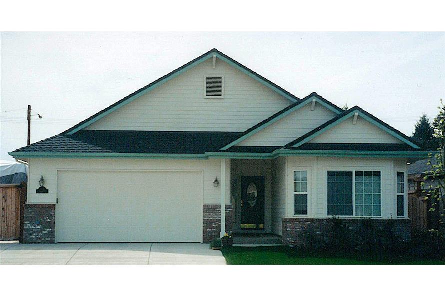 This is a single story Country style Ranch house with 1720 total living square feet. The Colonial themed home features painted corbels that highlight a trio of variously sized forward-facing gables. Display shelves line both sides of the entry hallway to the living room. Slender windows in the vaulted living room flank a gas fireplace.