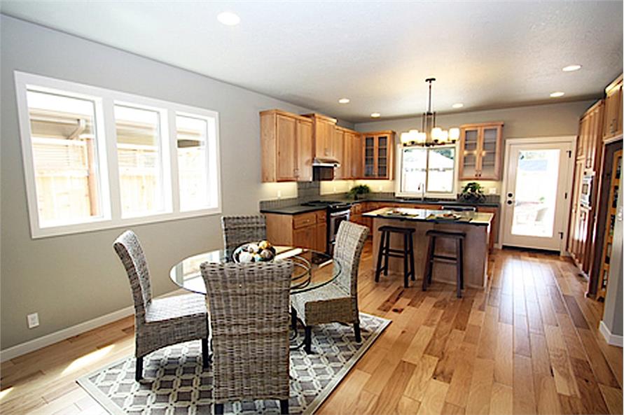 The open floor plan of the Great Room, dining room, and kitchen makes up the left-hand side of this transitional Shingle-style home. The house plan has a total floor area of 2,172 square feet of finished and unfinished space under its roof for family use. This home also has a rustic Ranch-style feel to it.