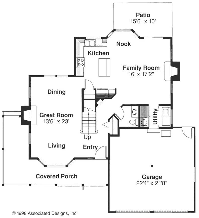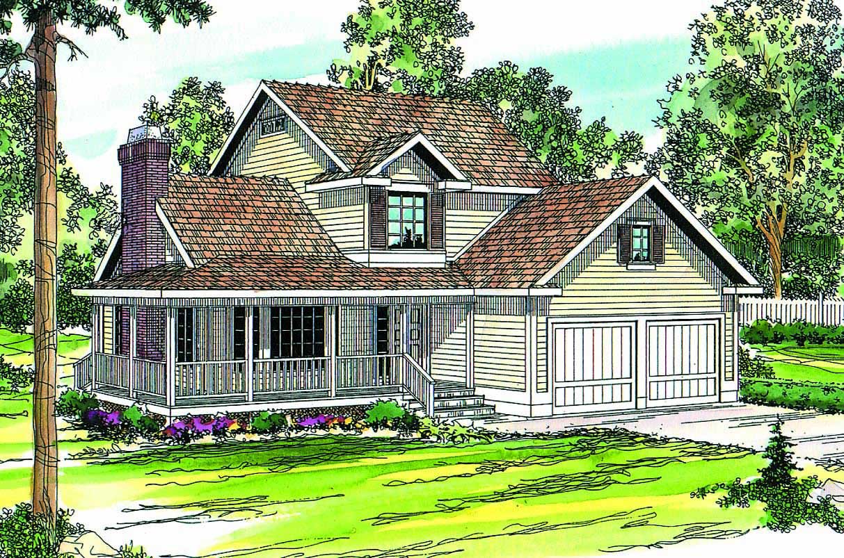 The #108-1167 home plan is a two story, country style house plan with 1764 total living square feet. The wrap-around covered porch accents the friendly, welcoming appearance of this county home plan. Two spacious living areas, formal and informal, fill the main floor. The master suite has two closets and a bright, cozy sitting area in the dormer.