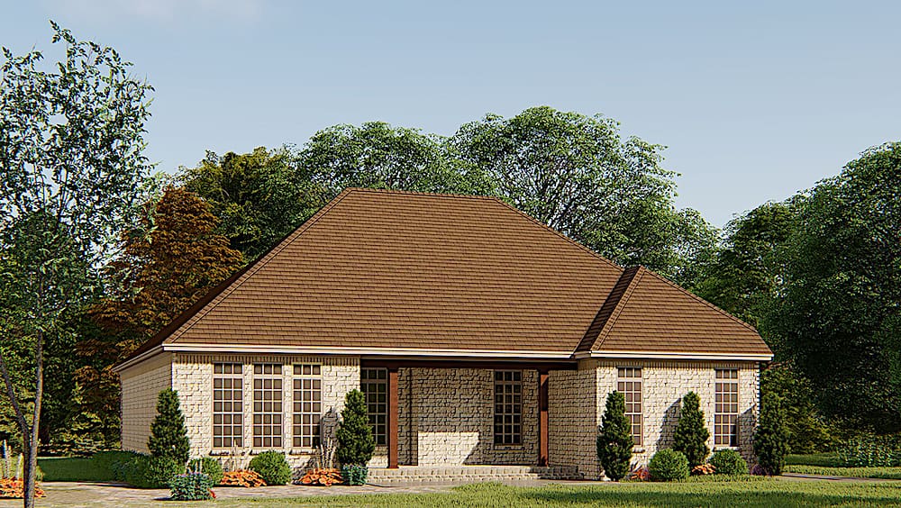 A very modest covered porch will welcome you upon stepping up to the front of this Traditional style house with Rustic trappings. The stone-covered front-forward gables, hip main roof, and shed dormer give the home a cozy and attarctive curb appeal. The well-done 1-story floor plan has 1750 square feet of finished living space and includes 3 bedrooms.