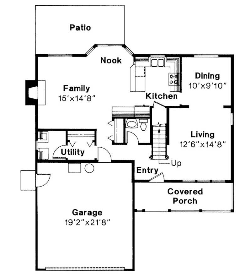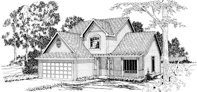 The #108-1190 house plan is a two story, country style home plan with 1753 total living square feet. A railed porch, fanlight window, and fish scale shingles create visual appeal for this country home plan. The fireplace and bayed nook add light and warmth to the family room and kitchen. There is a small bathroom just inside the entry, and bedrooms are all on the upper level.