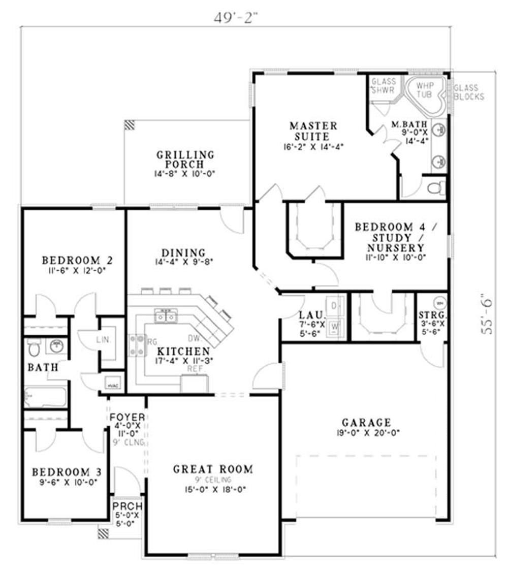 Front Porch with 12 inch brick column Foyer with 9 ft ceiling open to Great Room Great room with 9 ft ceiling Kitchen with snack bar open to Dining room with access to Rear Grilling Porch Master Suite with walk-in closet Master bath with corner whirlpool tub, glass shower and split vanities Bedroom 4 / Nursery /Study with walk-in closet Large Linen closet for Bedrooms 2 and 3