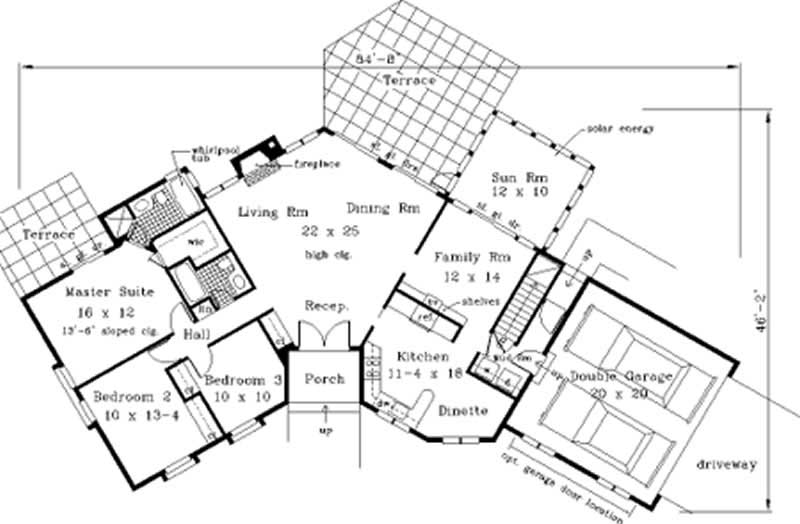 This unique angled design offers spectacular backyard views, a delightful sun room and two enticing terraces. The reception hall opens to the huge combination living and dining area, which is enhanced by a 13½-ft.-high ceiling. A stone fireplace and walls of glass add to the expansive look and the inviting atmosphere. The adjoining family room, kitchen and nook are just as appealing. The family room features a built-in entertainment center and sliding glass doors that access the energy-saving sun room. The comfortable kitchen has a handy snack counter facing the sunny dinette. The...