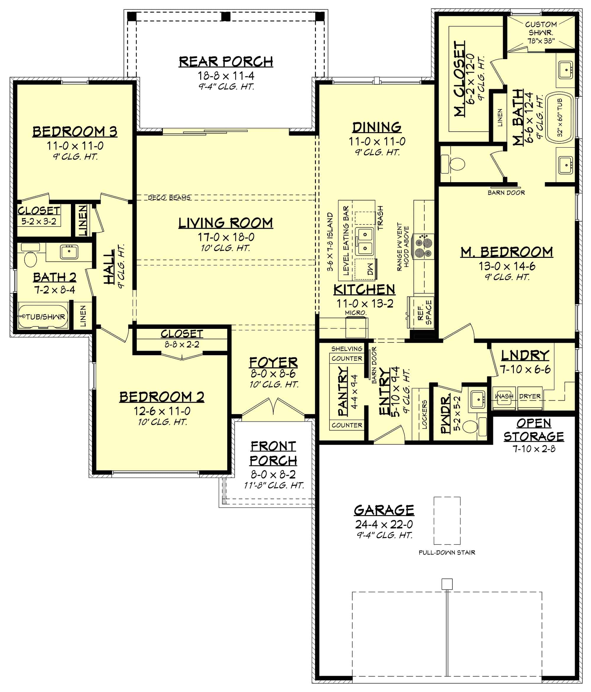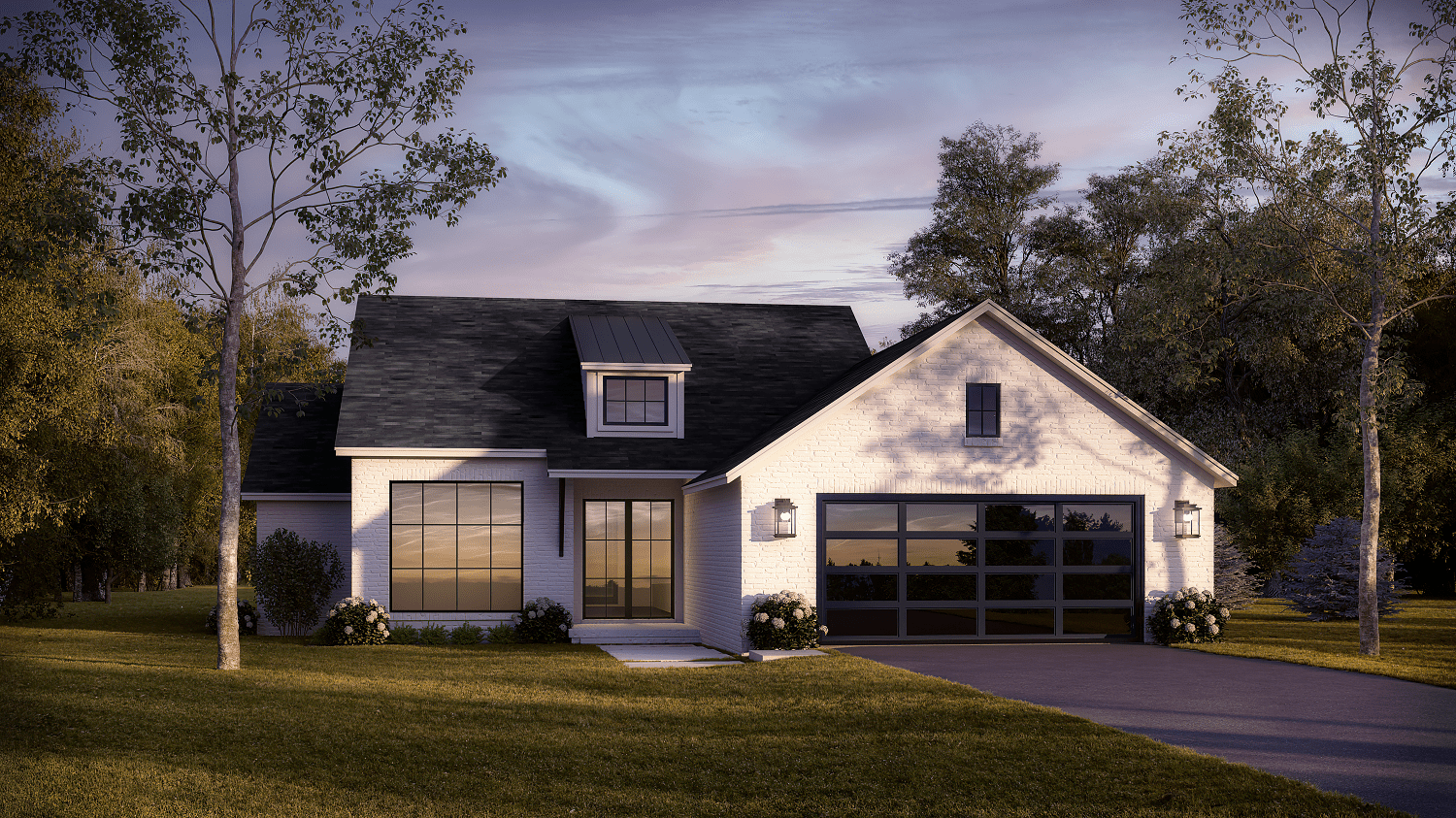 This ranch-style home offers 1,775 square feet of living space, featuring three bedrooms and two and a half bathrooms. The open floor plan connects the kitchen, living, and dining areas, creating a welcoming environment. The kitchen includes a large island and a walk-in pantry, providing ample storage and workspace. Adjacent to the kitchen, there's a mudroom and a powder room for added convenience. The primary suite boasts a walk-in closet and a well-appointed bathroom, while the two additional bedrooms share a full bath. The exterior combines vinyl siding, stone accents, and wood...