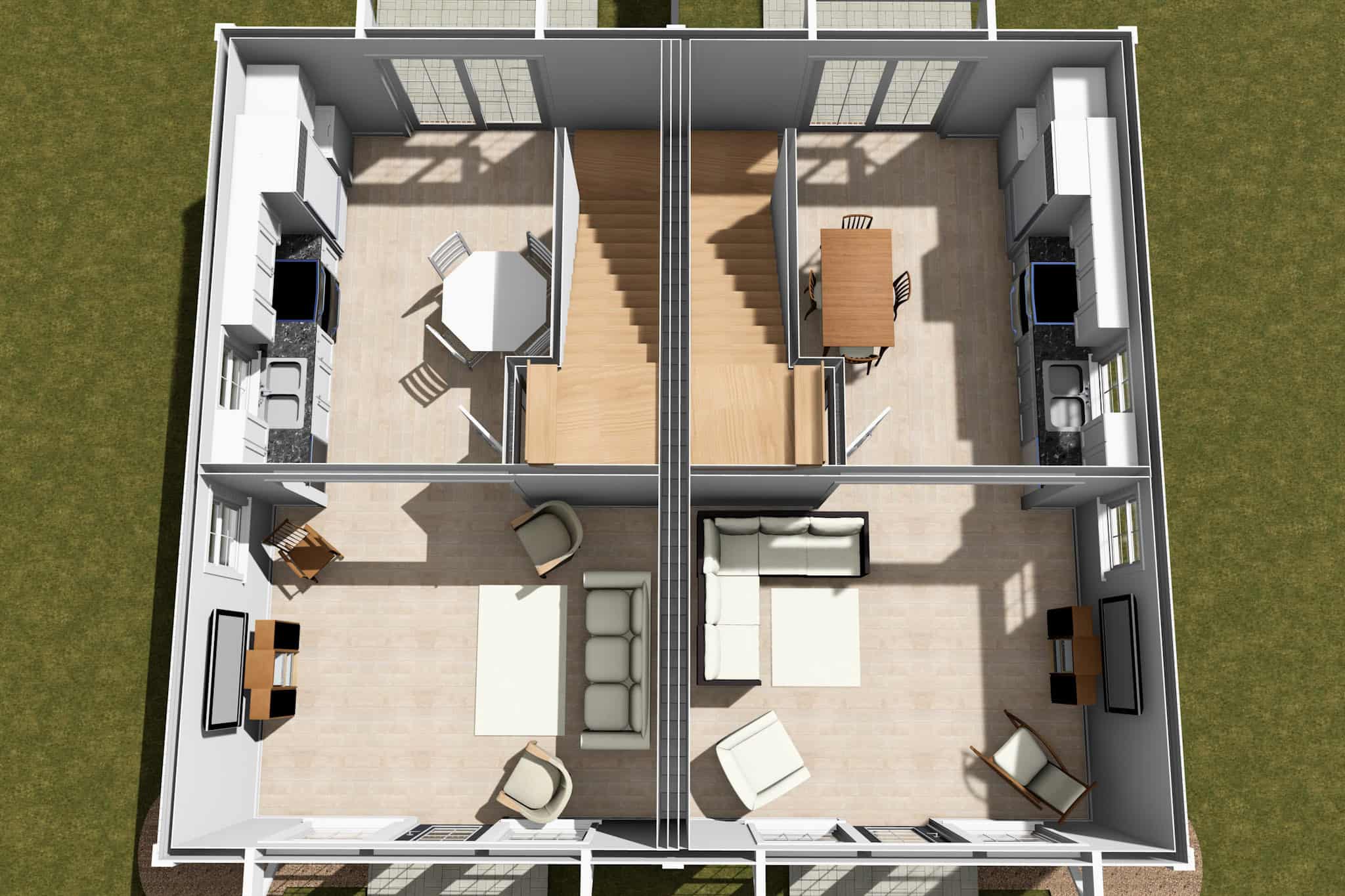 Duplex and Triplex Plans are Slab & 2x4 ONLY!! If you need to change either, please send in a modification request. This multi-family plan has two identical units. Each unit has 1,567 living square feet, 3 bedrooms, 2.5 baths, and 1 garage space.