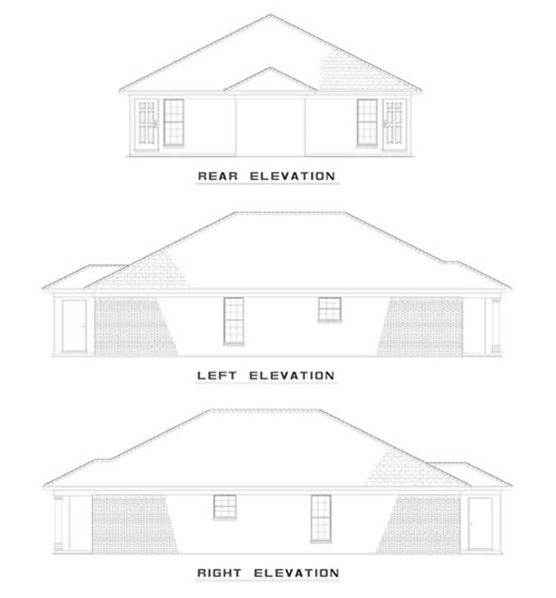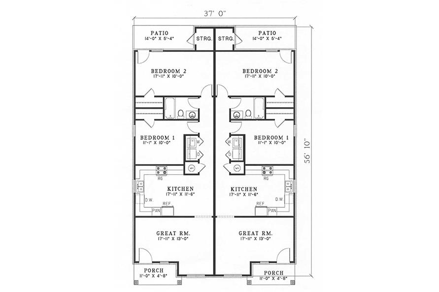 This contemporary ranch duplex plan will add class to any neighborhood. Brick columns and a hip roof enhance this two-bedroom plan with a large kitchen and small laundry closet. The great room is spacious and has a small sitting area by the front window. On the rear patio, you'll be able to have a drink with friends and watch the sunset.