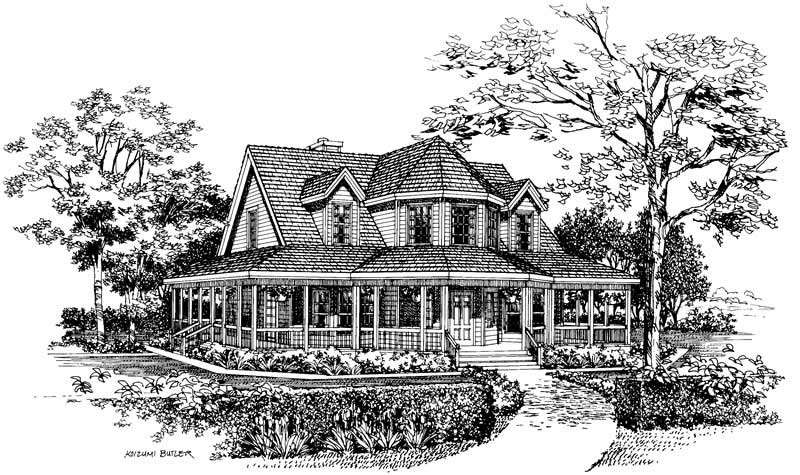 Victorian house plan that includes: wrap-around porch, beautiful master suite, Family/great room and foyer are open to above for an open floor plan.