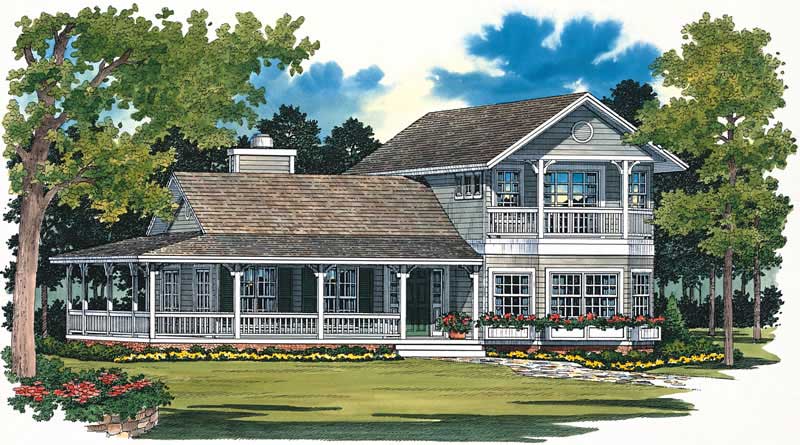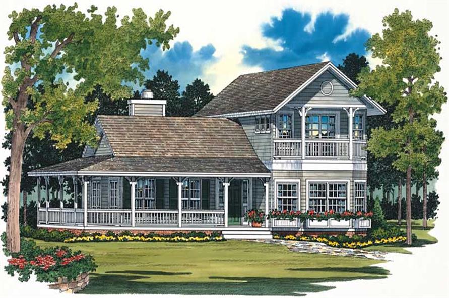 Two story country home plan with wrap around porch, spacious master bath, cozy nook in kitchen area with a snack bar, and 2 bedrooms upstairs.