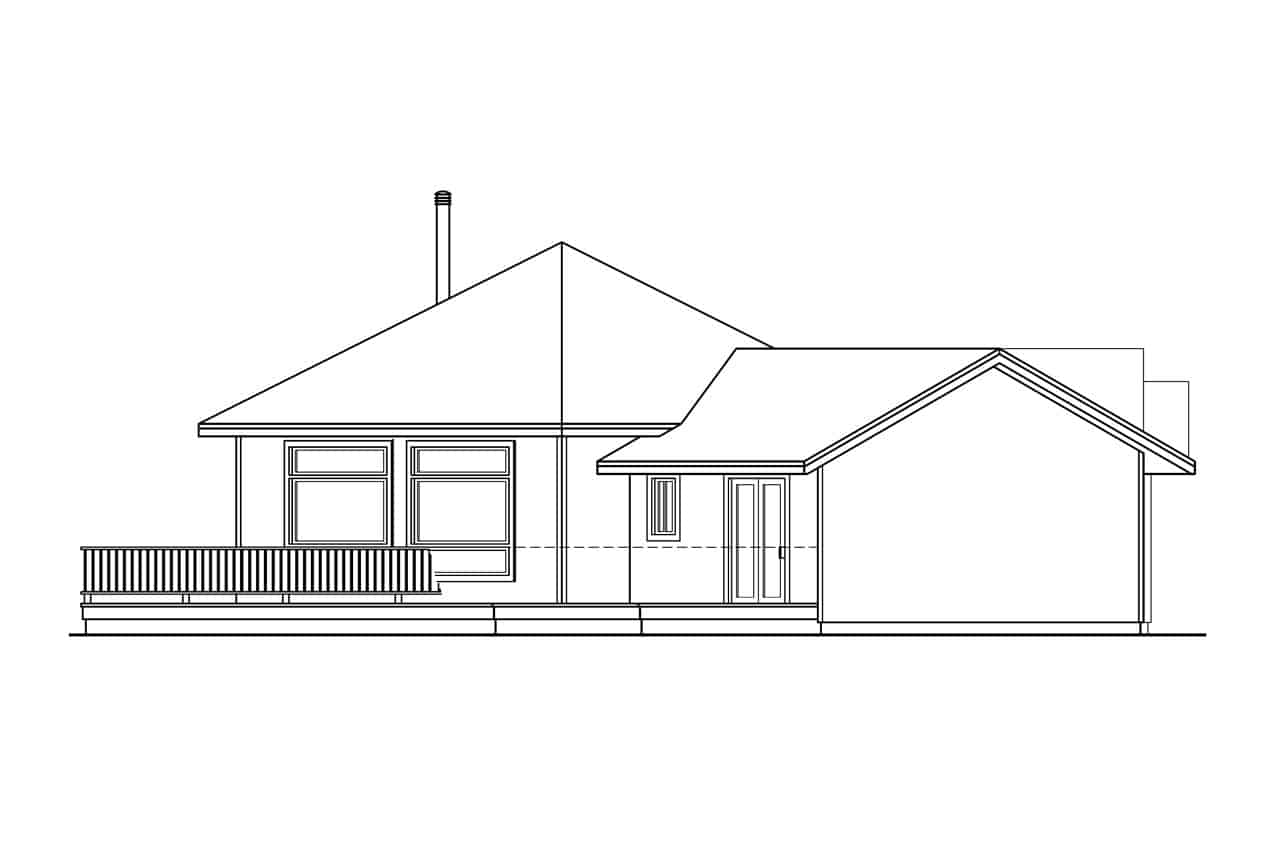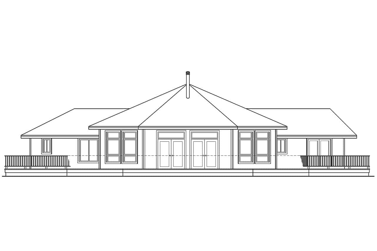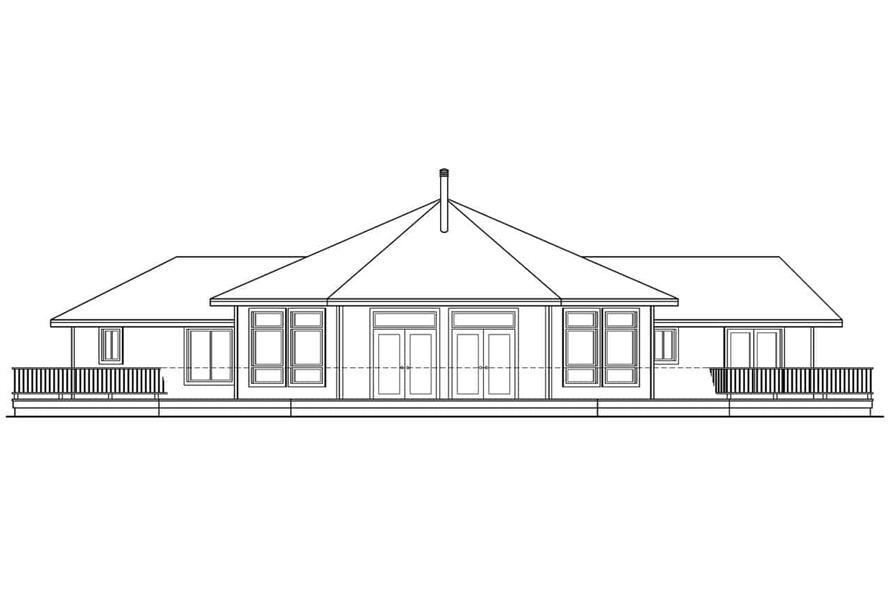 This is a single story, contemporary style house plan with 2001 total living square feet. This contemporary home plan has a large, dramatic, hexagonal core, with wings jutting out to the right and left. A wealth of sparkling windows look out across the wrap-around deck that rims the entire rear. Two peninsular kitchen counters are open to the great room which have rear views.