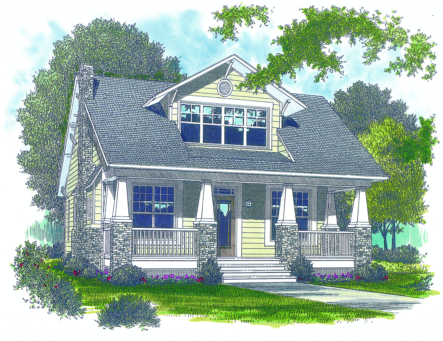 This lovely bungalow home with Craftsman influences (House Plan #180-1007) has 2010 square feet of living space. The 2 story floor plan includes 3 bedrooms. This home is ideal for a narrow lot.