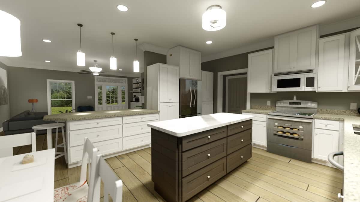 Step up to the front of the house, and the majestic-looking covered porch will welcome you and usher you to the grand entrance door, which leads to the open floor...