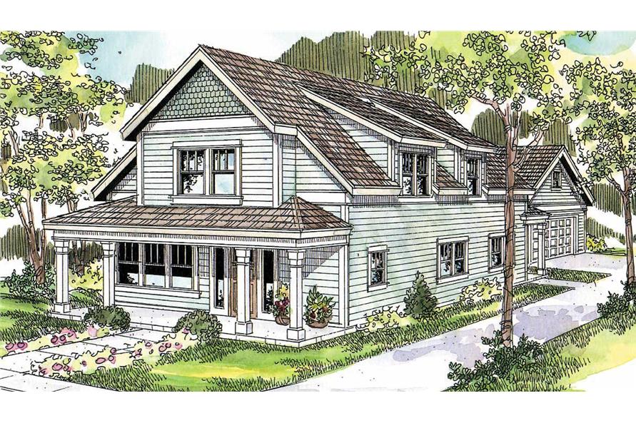 This house plan is a two story, Country Style house plan with 2128 total living square feet. The foyer of this country home plan is brightened by the sidelights that open into the living room which links to the dining area. The kitchen boasts built-ins, a pantry, desk, and a work island rimmed by an eating bar. Dormers on both sides of the study/loft upstairs create cozy, semi-private alcoves.
