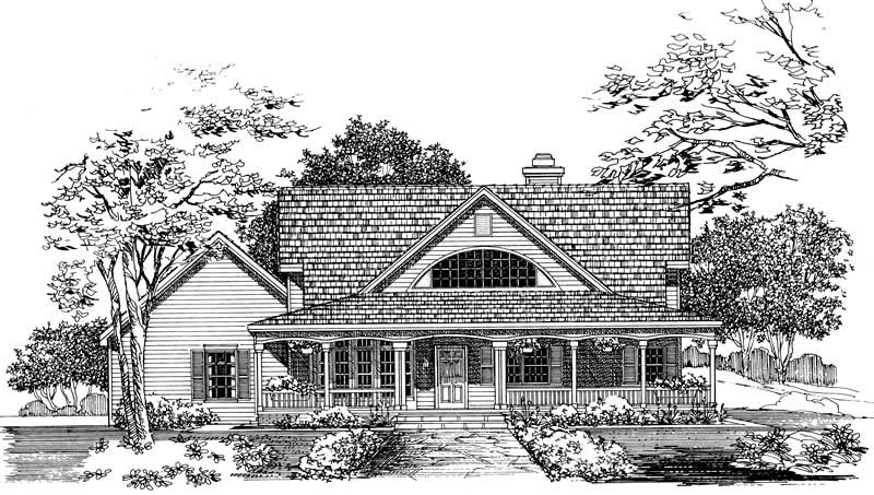 Country house plan with a large master suite, coverd porch in front and back and two bedrooms upstairs.