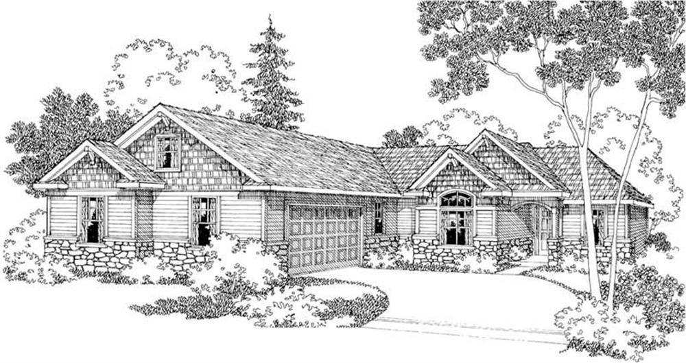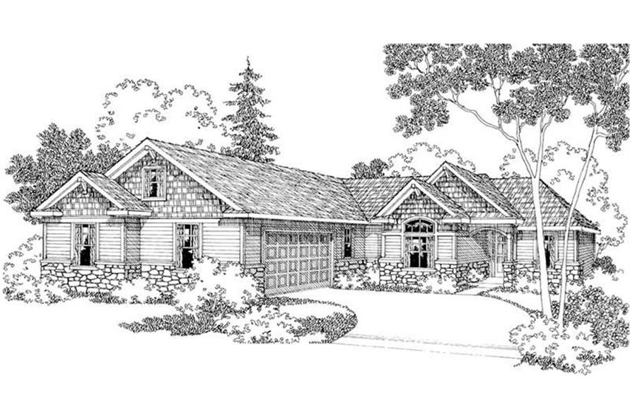 The #108-1228 home plan is a single story, transitional style house plan with Craftsman influences and 2183 total living square feet. The bright & vaulted living room in this transitional home plan is centrally located and conveniently open to the kitchen. Stone veneer & wood corbels highlight the exterior craftsmen detailing. Double doors next to the arched display cove open into the luxurious master suite.