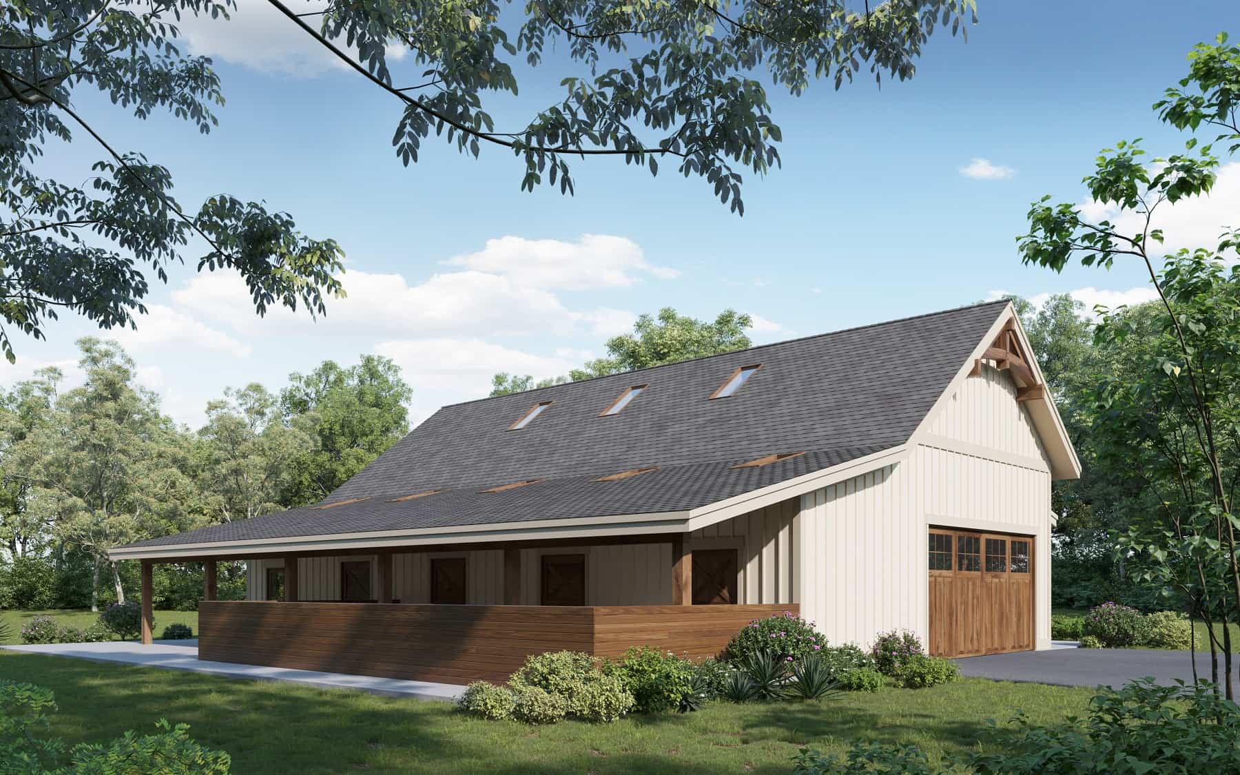 This attractive barn has 2,185 square feet of living space with three stalls, a tack room, a grooming area, and a space for an RV and plenty of storage. This outbuilding would certainly add a touch of beauty to the landscape.