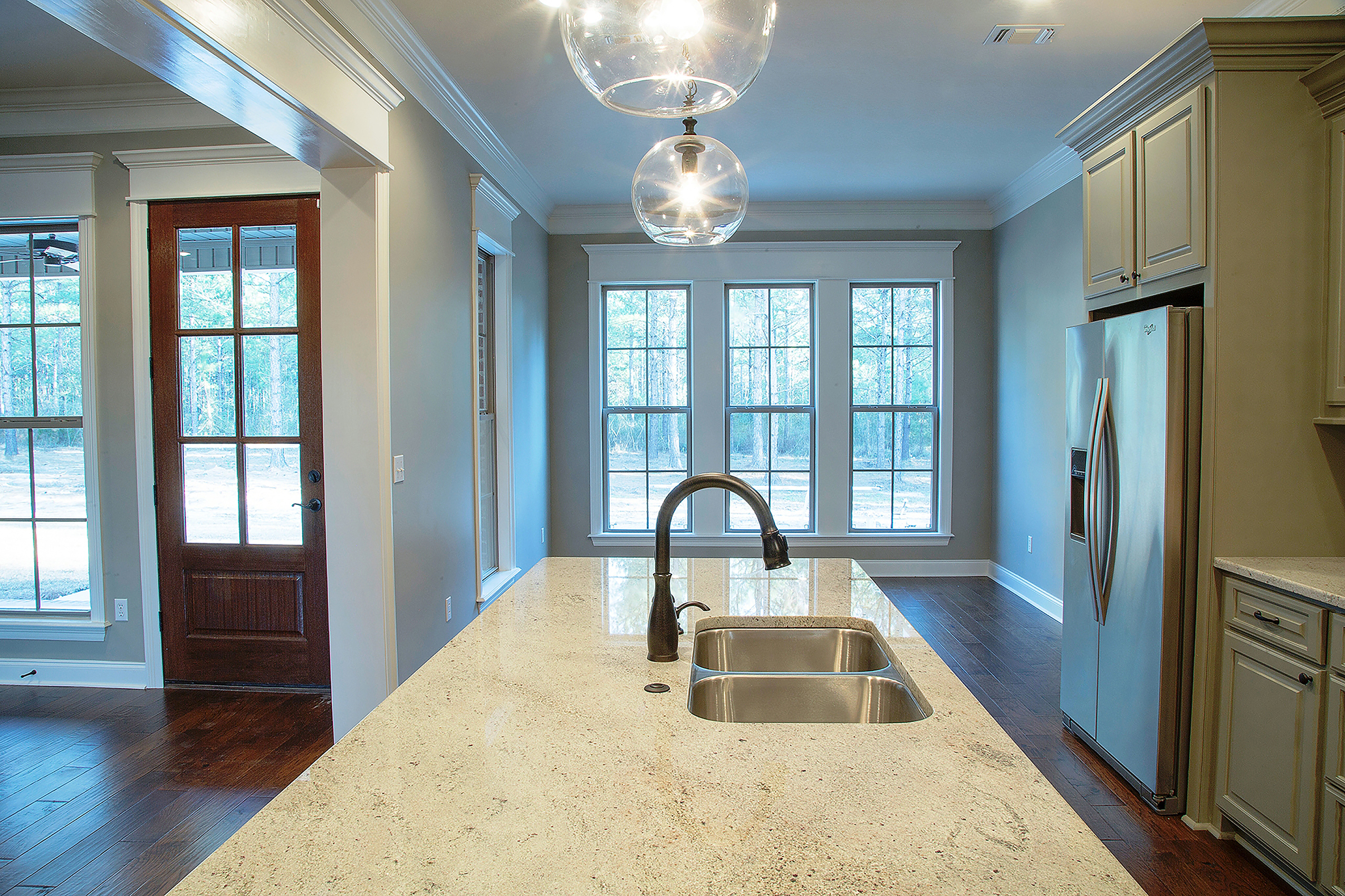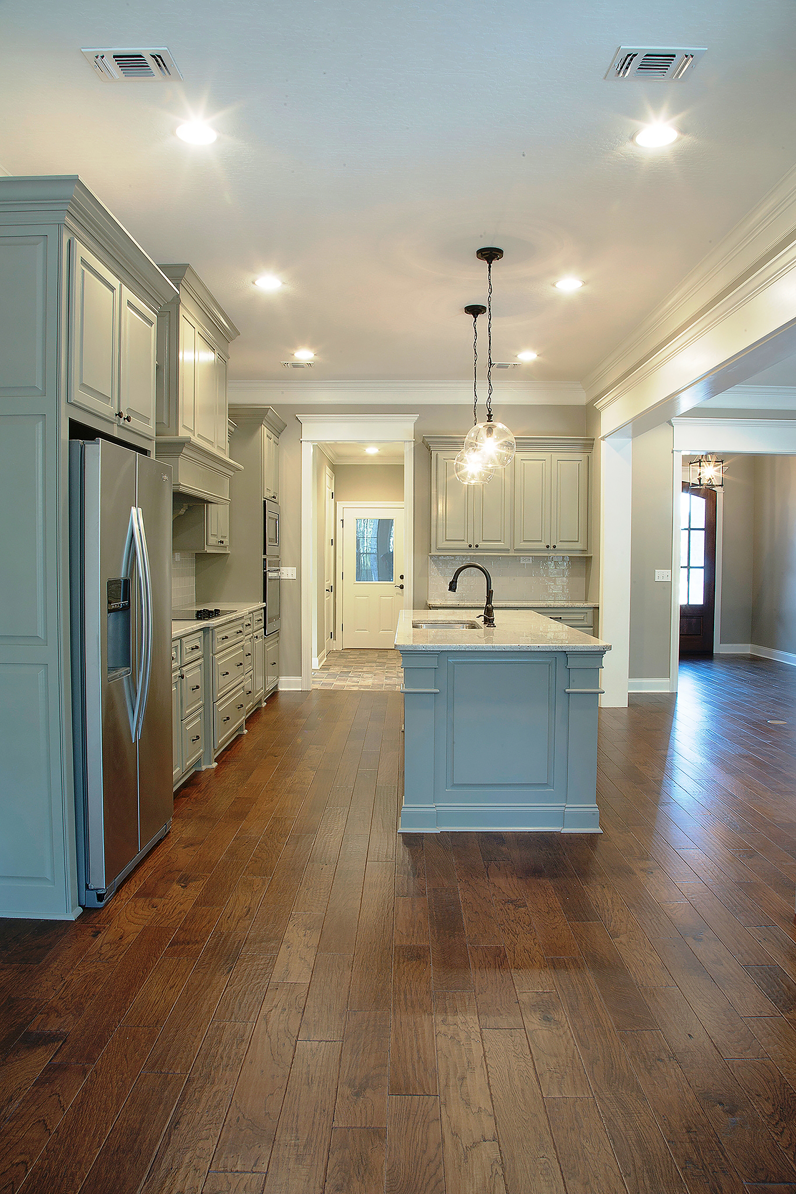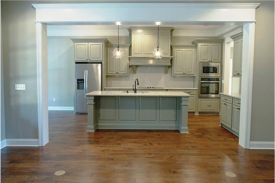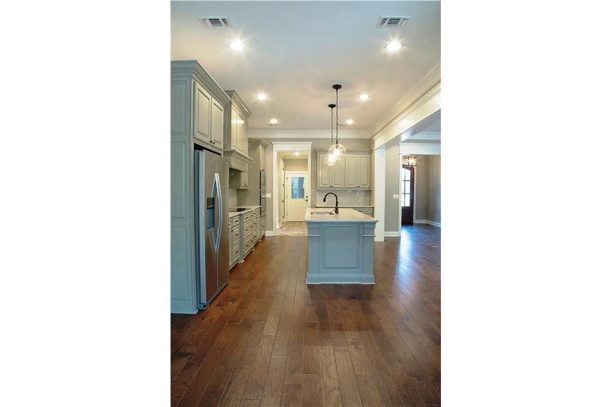 The kitchen boasts a large island with a built-in eating bar. From the kitchen, you can enter a hallway that leads to the walk-in pantry, a...