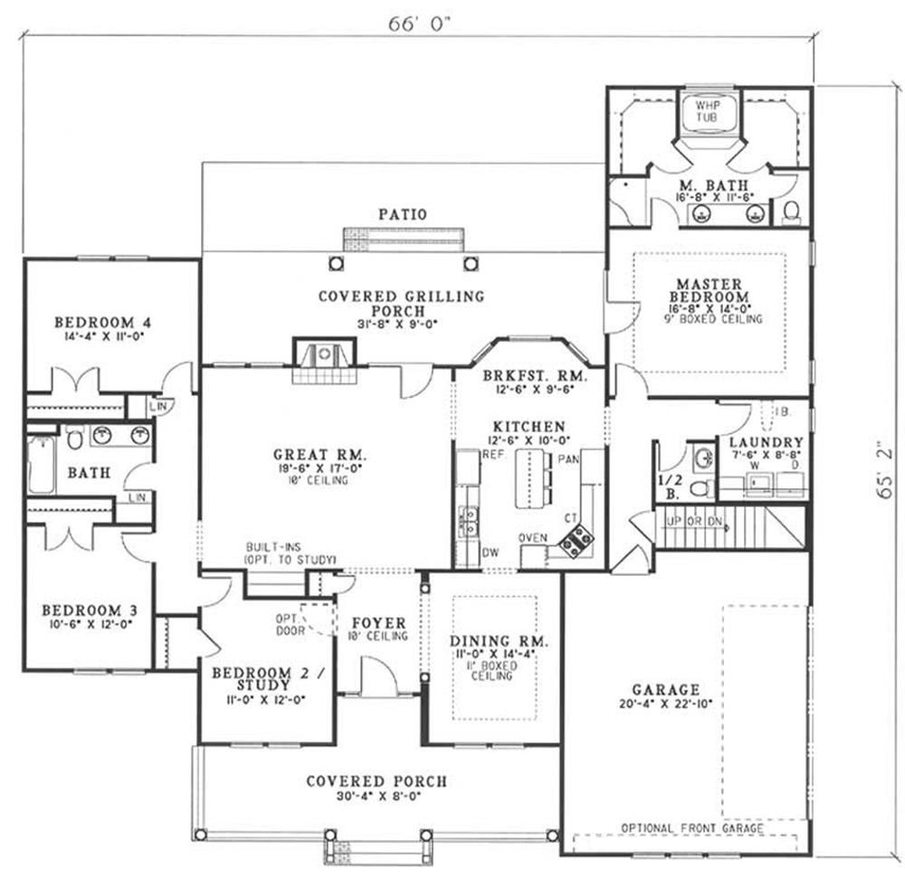 This extraordinary four-bedroom house plan showcases a master suite so elegant it demands its own wing. You'll have a tough time deciding where to entertain with two impressive covered porches and a delightful great room offering the comfort of a cozy fireplace. The center foyer opens to a boxed ceiling dining room and optional study with bookshelves. The master bedroom adorns a 9 foot ceiling and has a bathroom including 'his and her' walk-in closets centering a whirlpool tub. A bonus room is available upstairs for future needs.