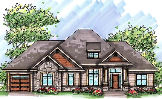 Inspired by the Craftsman era, this ranch house plan combines a unique blend of stone and shingle siding to create a home that’s bursting with curb-appeal. Arched soffits, plant ledges and art niches are just some of the extras that give this home an extra appeal that is sure to draw the attention of many buyers. The open floor plan features a well-appointed kitchen with a breakfast bar and walk-in pantry, while the adjacent great room pleases with a fireplace flanked by built-in cabinets. The master suite is tucked behind the garage away from two more bedrooms...