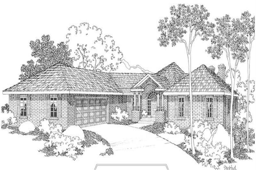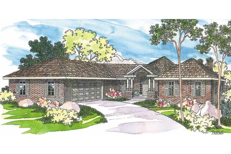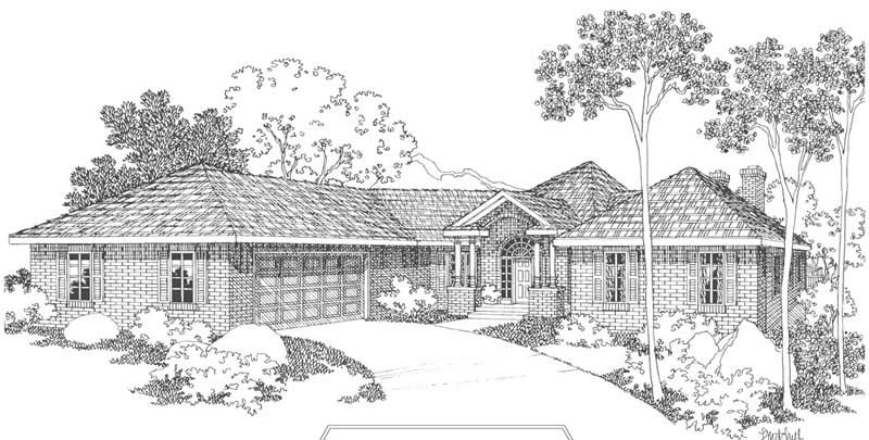 The #108-1492 home plan is a great single story, traditional style house plan with 2365 total living square feet. This contemporary, traditional home plan features a vaulted covered porch which has an arched brick opening over double columns. The window-rich hexagonal great room has a vaulted ceiling and a brick fireplace. The elevated panoramic deck wraps across the rear above the walk-out basement.