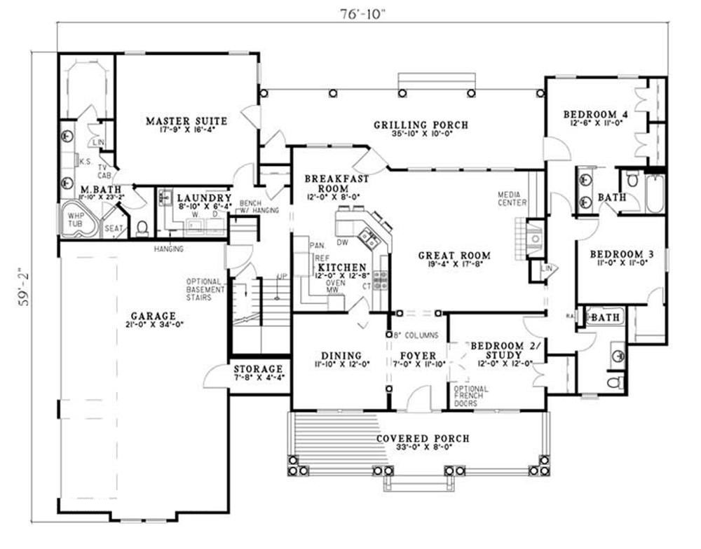 Bonus 1- 687 sq.ft. Bonus 2-896 sq. ft. 3 car Garage 10 inch round round columns on Front Porch Foyer with 8 inch columns to Dining and Great Rooms French doors to Study/ Bedroom 2 Great Room with Media center, fireplace and view from rear of the home Kitchen open to Breakfast Room with access to Grilling Porch Master Suite with access to Porch Master Bath with closet, two vanities and corner whirlpool Bedrooms 3 and 4 with access to bath Laundry with sink Kid's Nook off Garage with storage bins Upper Floor with two diferent options or complete entire area for Media Room
