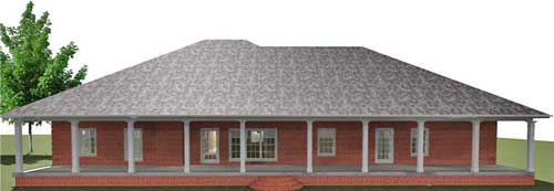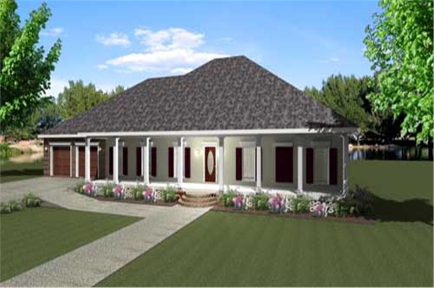 This covered front porch welcomes you into the country house plans DP-2381. The floor plan includes a master suite, kitchen and dining areas, large great room, and 2 other bedrooms. This plan has a front loading 2 car garage.