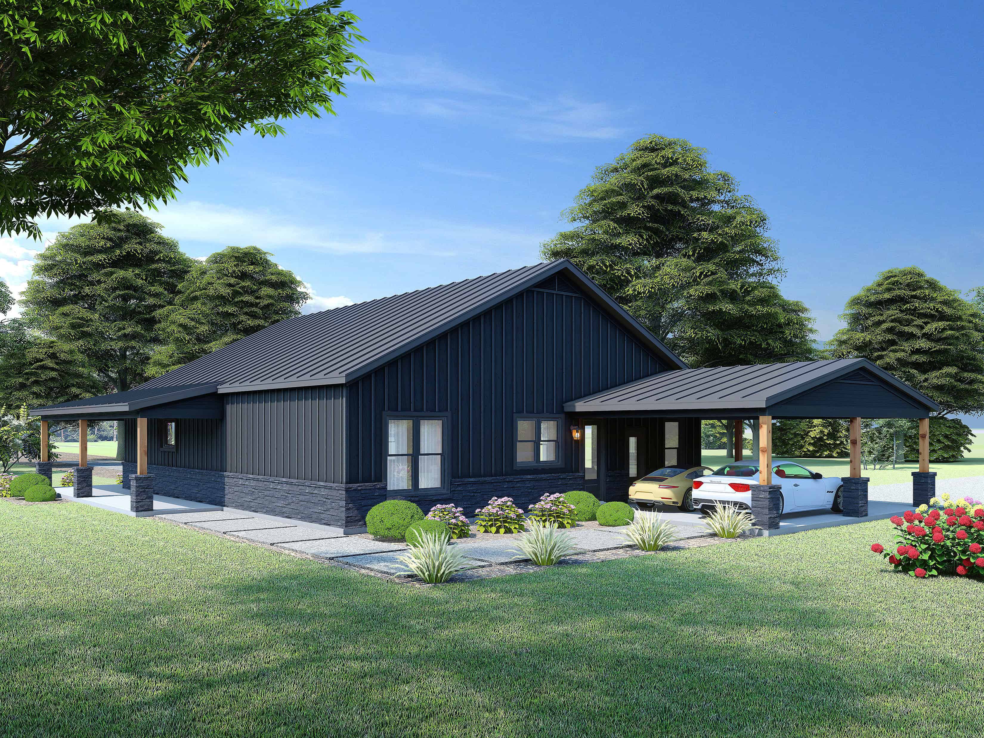 Discover our 3-bedroom, 2393 sq. ft. Barndominium! This stylish plan features an open floor layout, a dedicated dining room, a home office, a Jack and Jill bathroom, ample storage, a walk-in pantry, charming front/side porches, and a 2-car carport. Perfect for modern living!