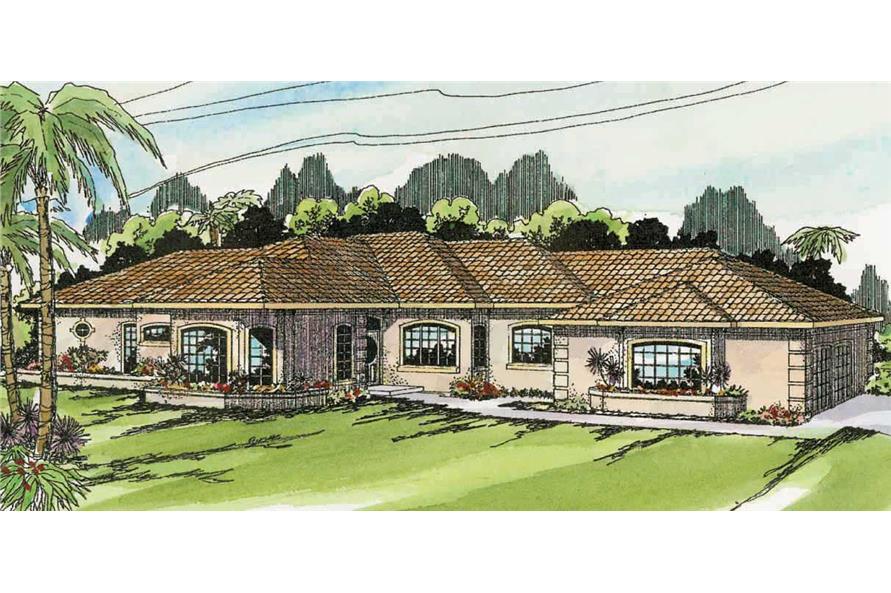 The #108-1307 home plan is a single story, Mediterranean style house plan with 2414 total living square feet. The raised stucco planters of this Mediterranean home plan accents the graceful arched multi-paned windows. The two-car garage has a built-in workbench, plus plenty of storage space. The patio is accessible from the huge screened porch and the well-appointed master bath.