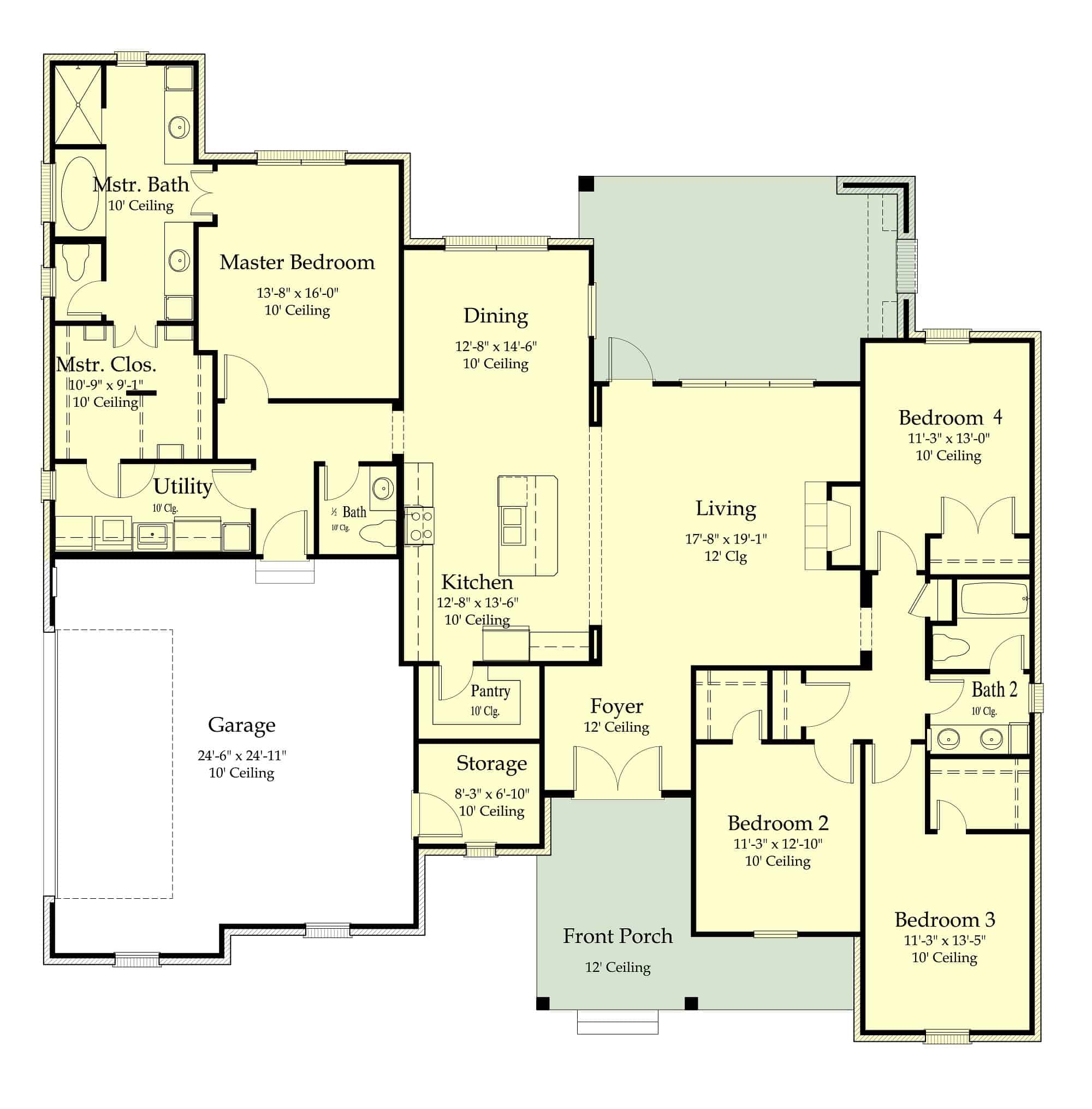 This beautiful Ranch home with Modern Farmhouse influences has over 2,400 square feet of living space. This wonderful 4 bedroom, 2.5 bath house plan has the following amenities: