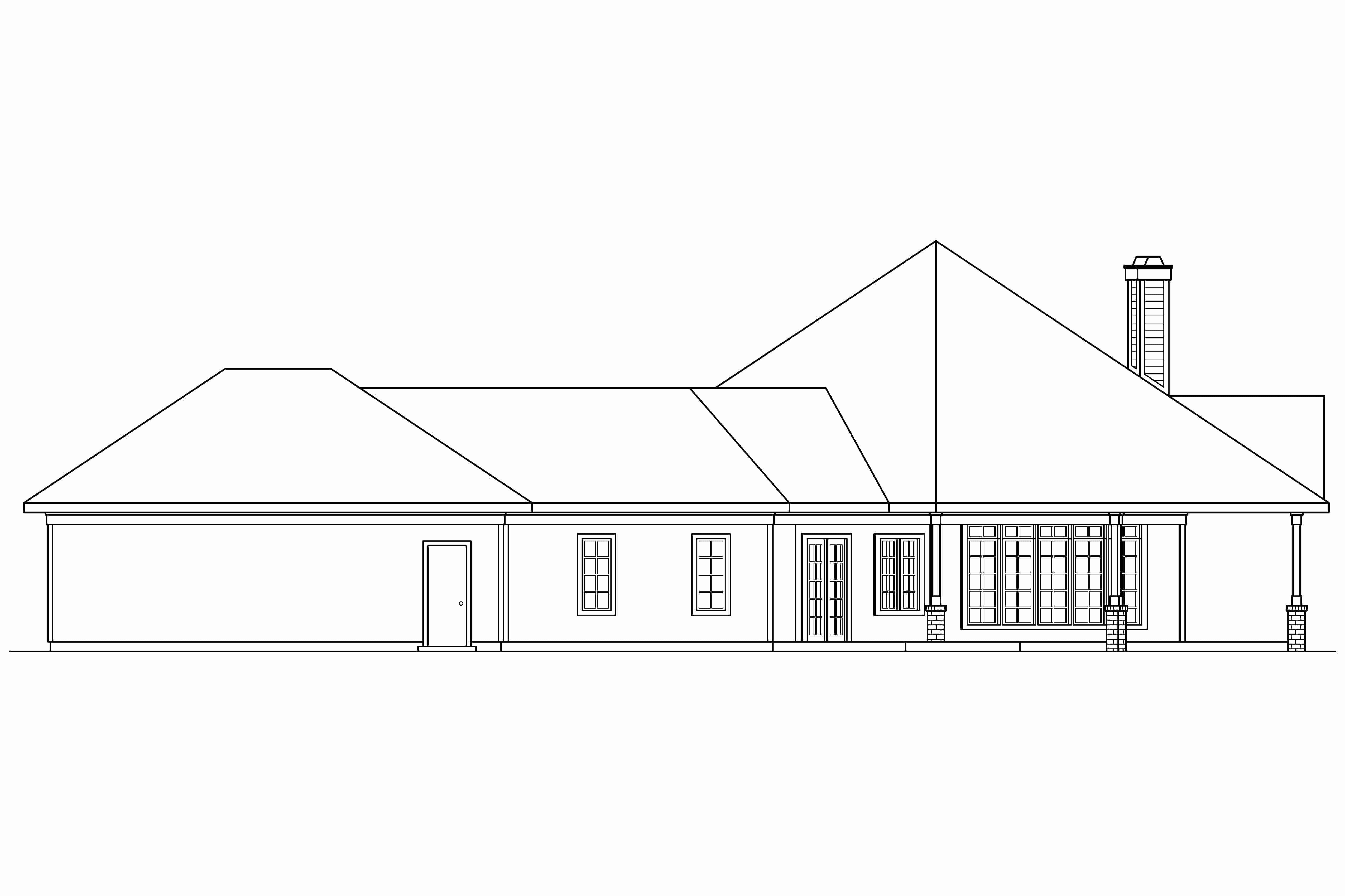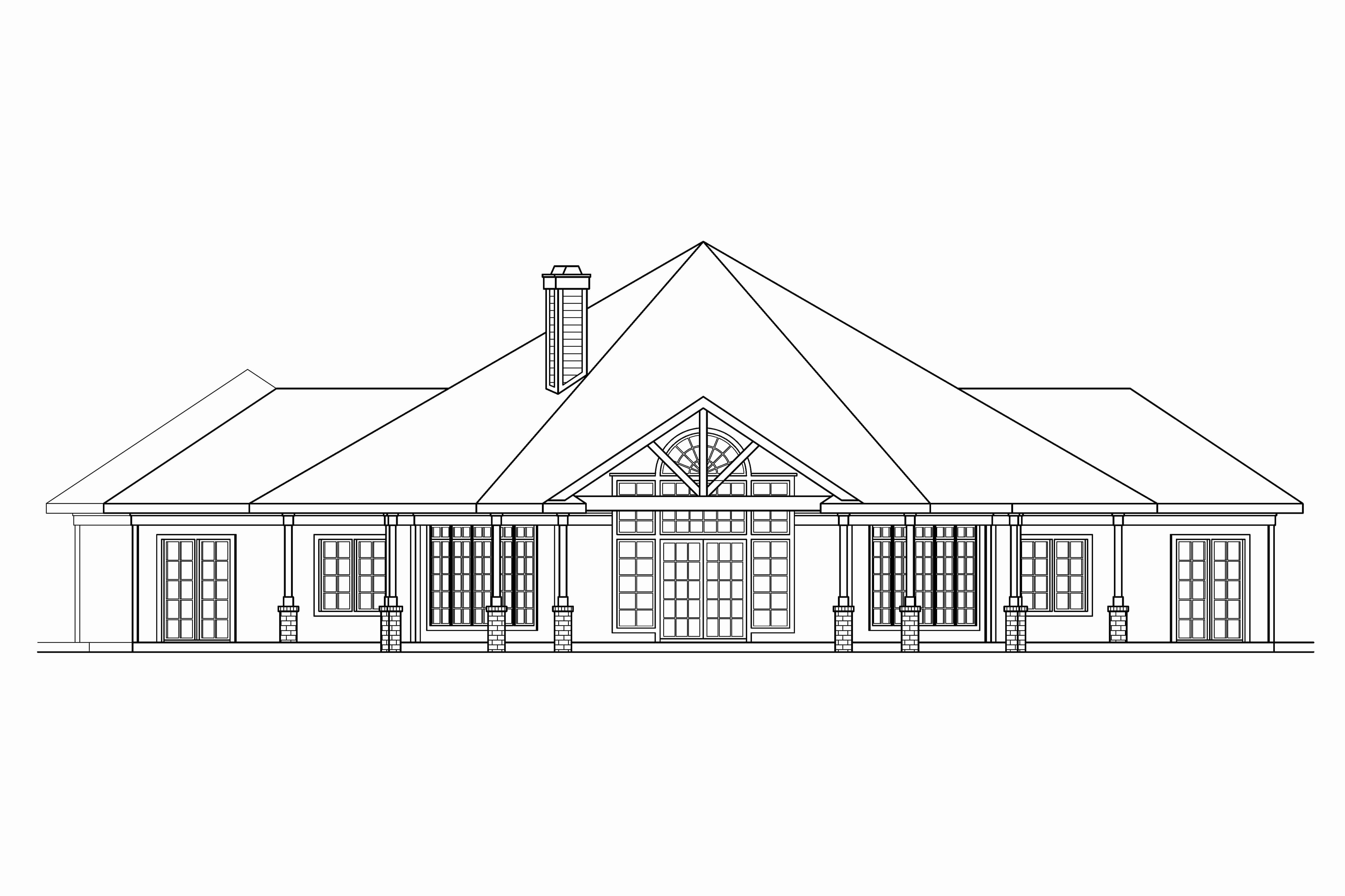 This is a two story, Contemporary Ranch style house plan with 2958 total living square feet. The classic columns highlight this contemporary Georgian home plan's impressive entry. Partially vaulted, hexagonal great room, wings extend forward, on the right and left. Left wing holds the home office and owners suite with a roomy walk-in
