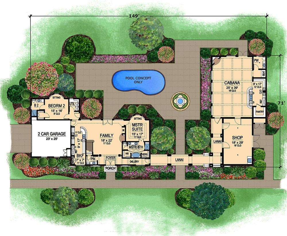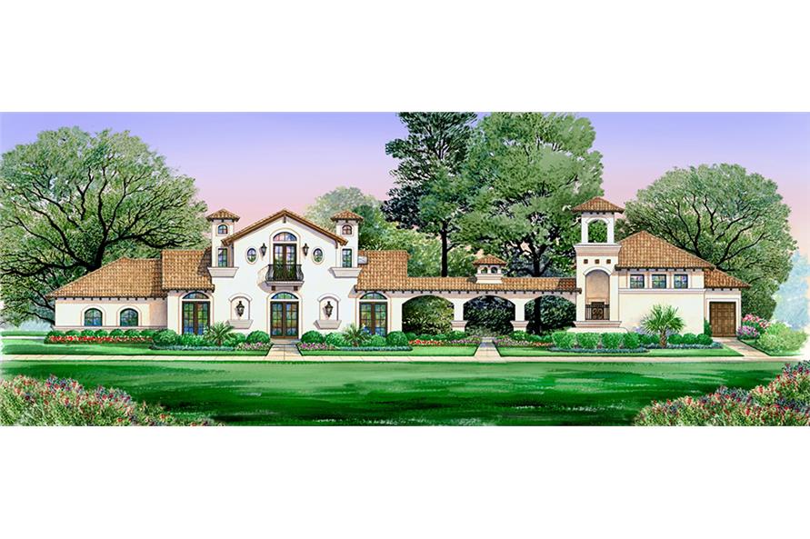 This lovely Mediterranean style home with Spanish influences (House Plan #195-1130) has 2502 square feet of living space. The 2 story floor plan includes 4 bedrooms.