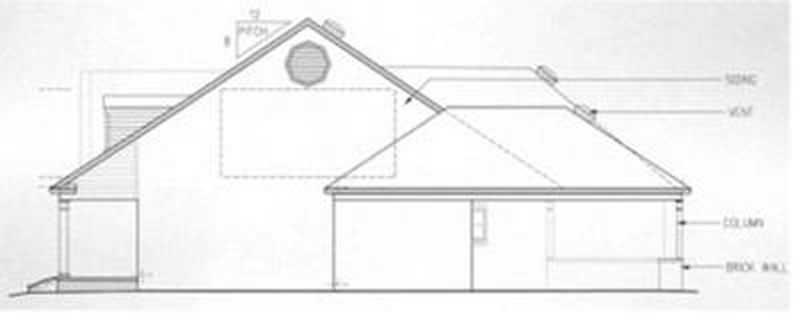 This Ranch style home plan has three bedrooms, 2.5 baths, and a detached two-car garage with storage area. Front country-style porch leads in to foyer with access to a hallway, formal dining room, living room with fireplace. Kitchen with island, eating area, and rear porch are in back of the house. Bedrooms line the left with master suite including large bathroom and 2 closets. Upper level includes bonus area, walk-in closet, and attic.