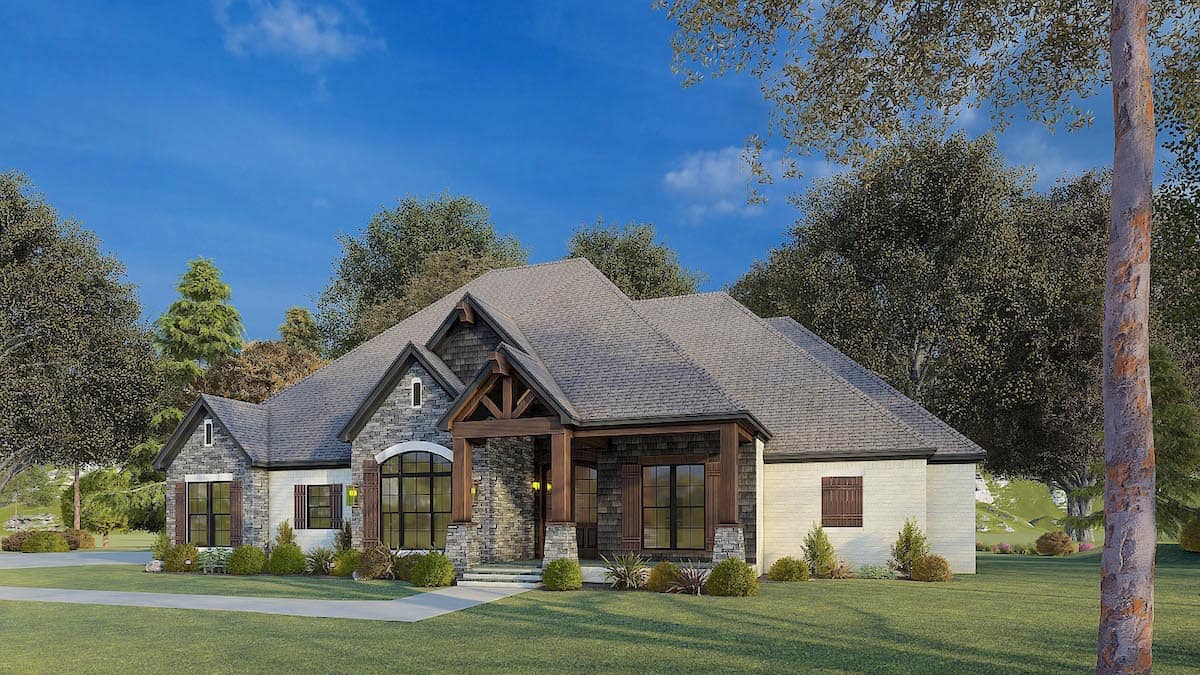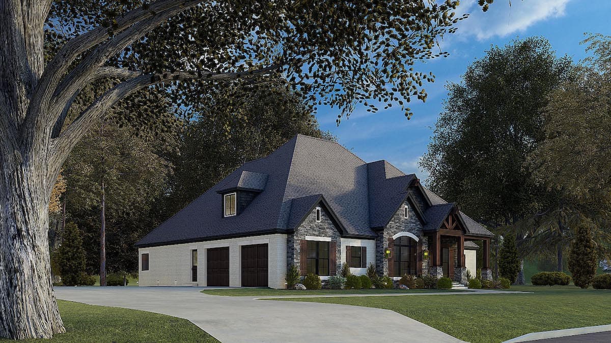 The forward-facing gables, large windows in front, and cozy covered front porch give this European home with French style an interesting character. The wonderful house also provides spacious rooms that every member of the family will surely love. The remarkable home's 1-story floor plan has 2537 square feet of fully conditioned living space and includes 4 bedrooms